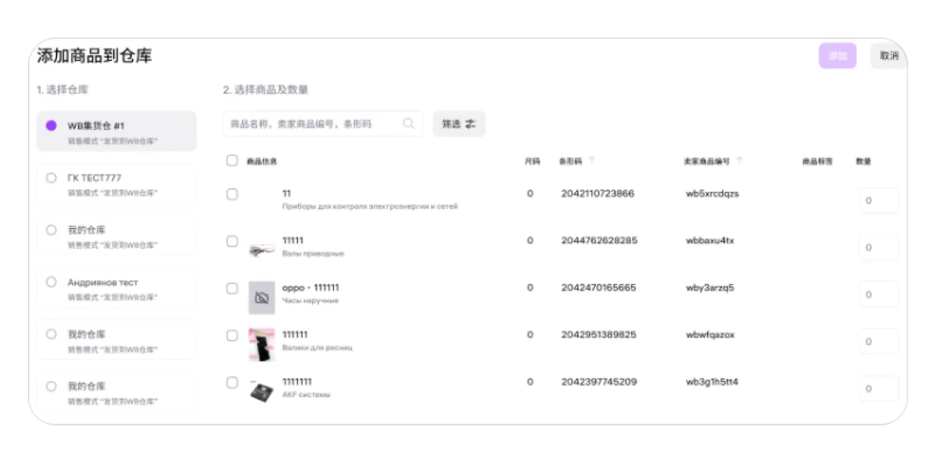 接下来,在左侧选择仓库,并勾选想要添加的商品。然后在右侧的栏位中填写库存数量。