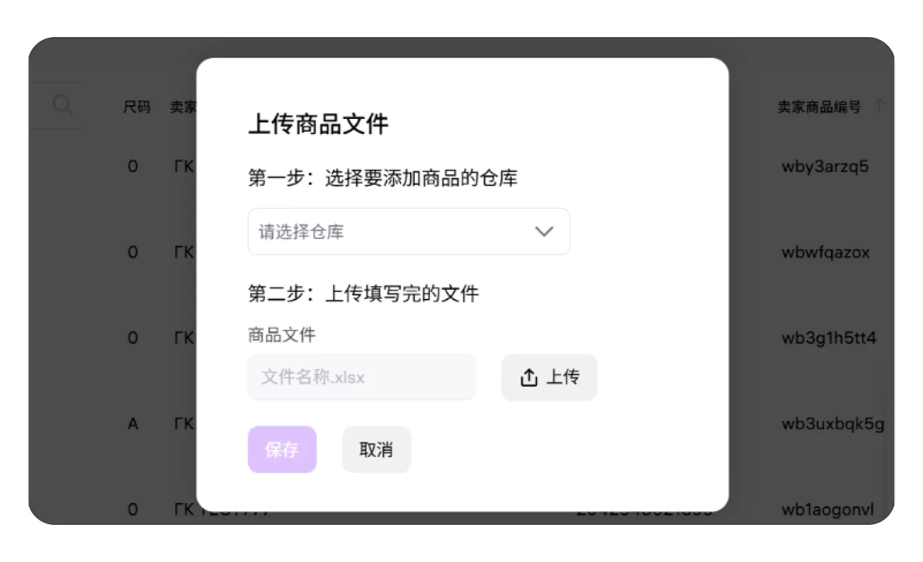 在弹出的窗口中选择库存所在的仓库并上传文件,然后点击“保存”。