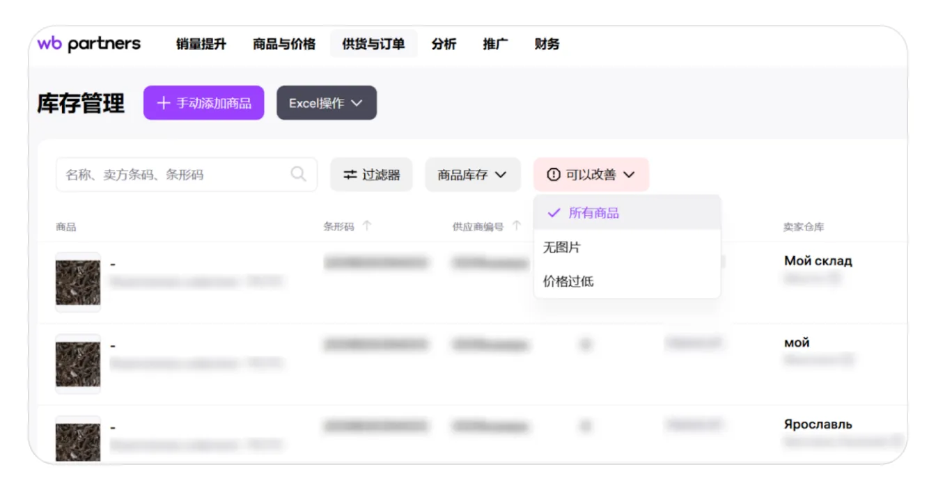 请注意,如果您的商品存在一些重要问题,页面上会出现“可以改进”小部件。点击它后,右侧会打开一个面板,显示所有需要编辑的商品页面,例如添加图片或设置正确的价格。此外,在总清单中,这些有问题的商品页面会出现红色的可点击提示。点击提示同样会打开一个面板,汇总所有存在错误的商品页面。您也可以从这里快速跳转到卖家后台的相关版块,例如在商品页面中添加图片或设定正确的价格。