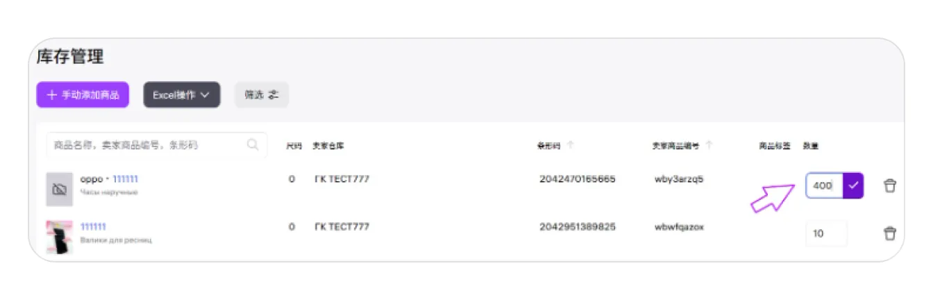 已上传的库存可随时编辑。可手动修改“数量”一栏中的数值,并点击对勾图标保存。
