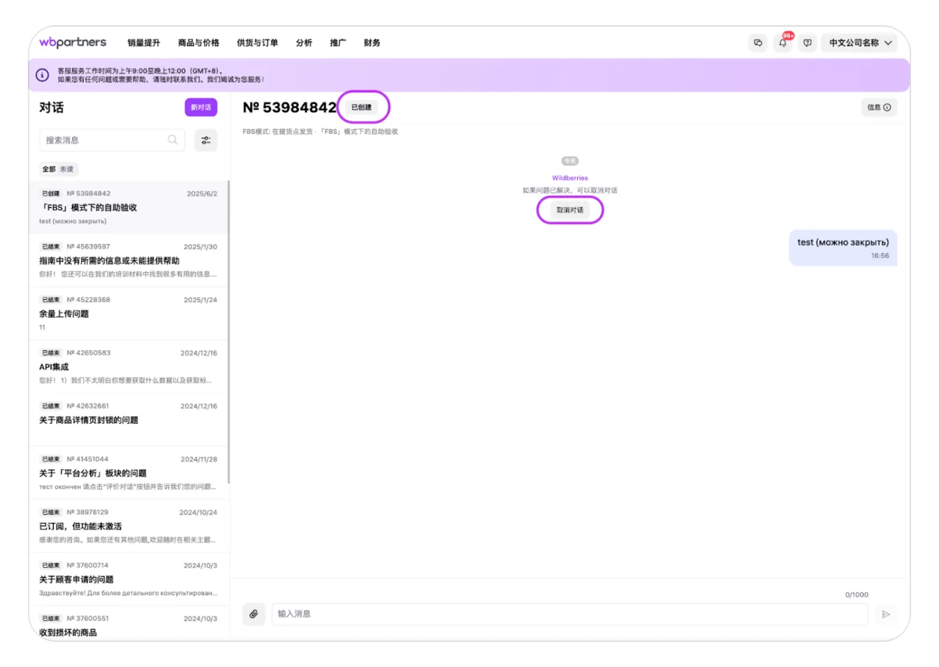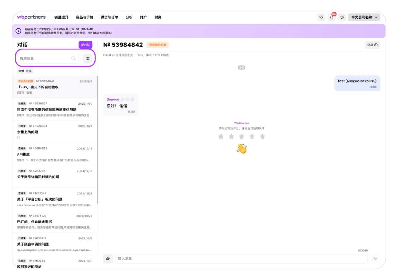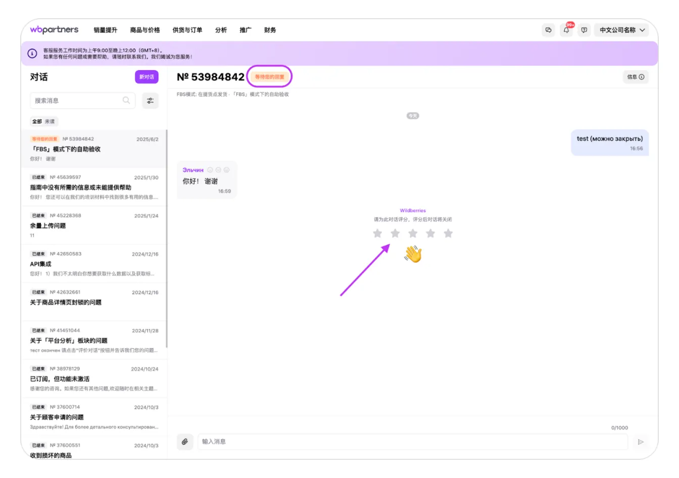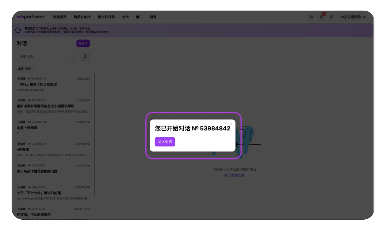 如果在使用卖家后台时遇到困难,或者在执行某些操作时出现意外错误,而在野莓帮助中心上没有相应的解决方案,卖家可以通过在专门页面创建对话来联系技术客服。 要想进入“客服客服”,需要将鼠标悬停在对话框中的问号图标上。会出现一个下拉菜单,其中“客服客服”将显示在最上方。可以通过单击名称进入。
