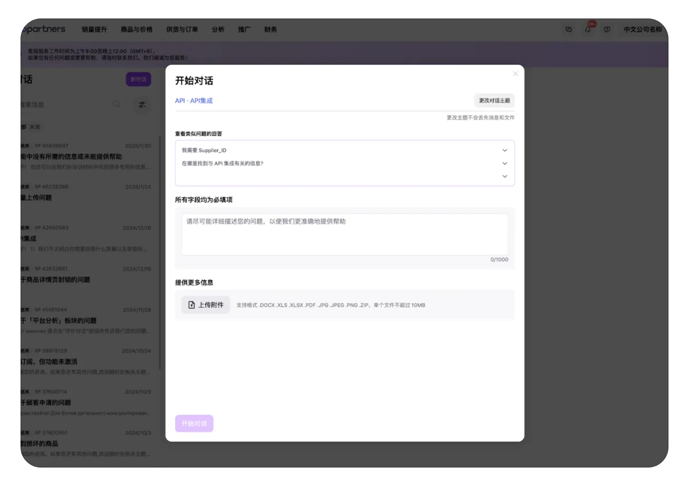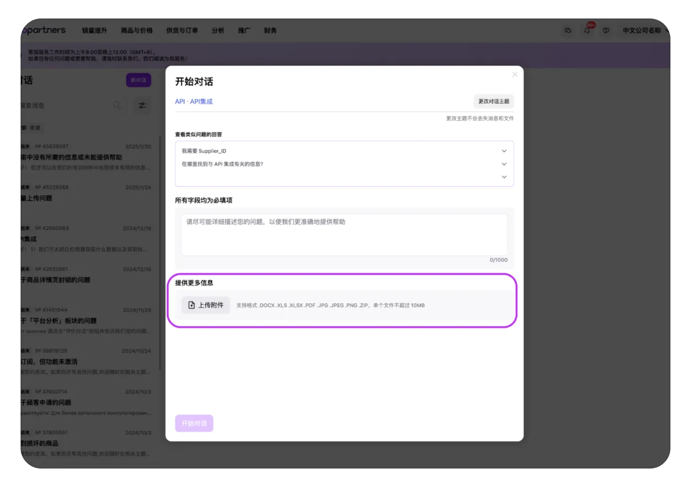 在您完整填写了所有必填字段(带星号的字段)并填了附件后,“开始对话”按钮将变为可用。