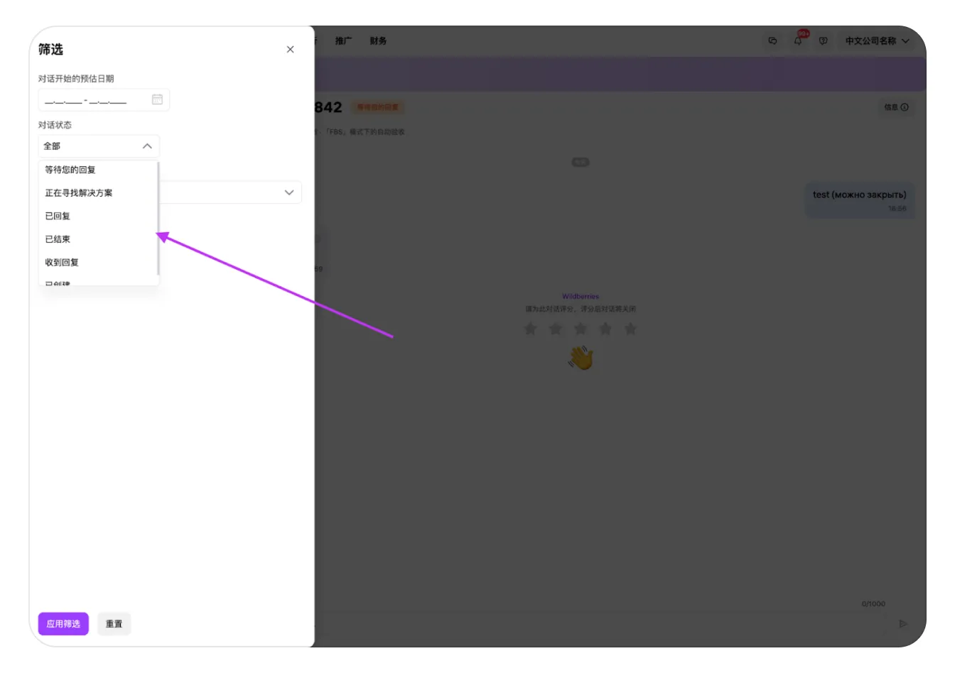 当您收到回复时,对话的状态将变更为“收到回复。待评价”。