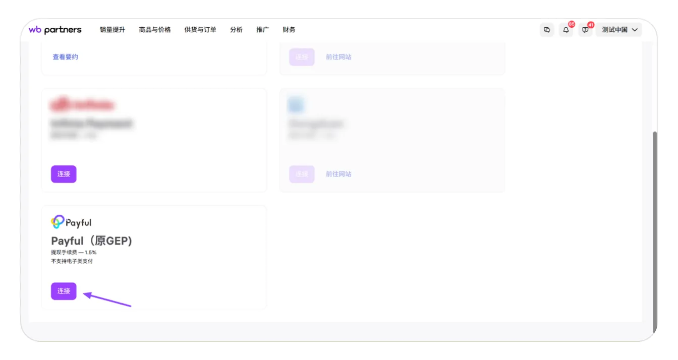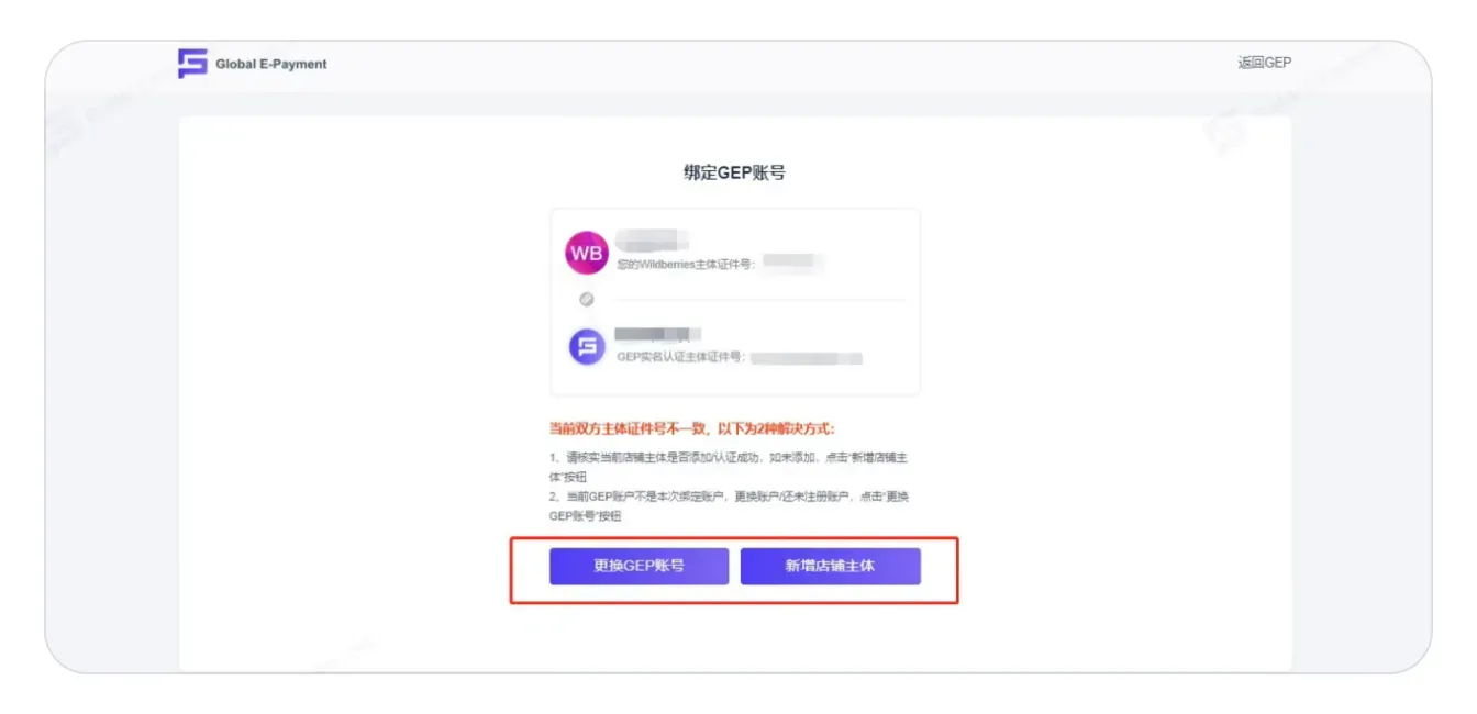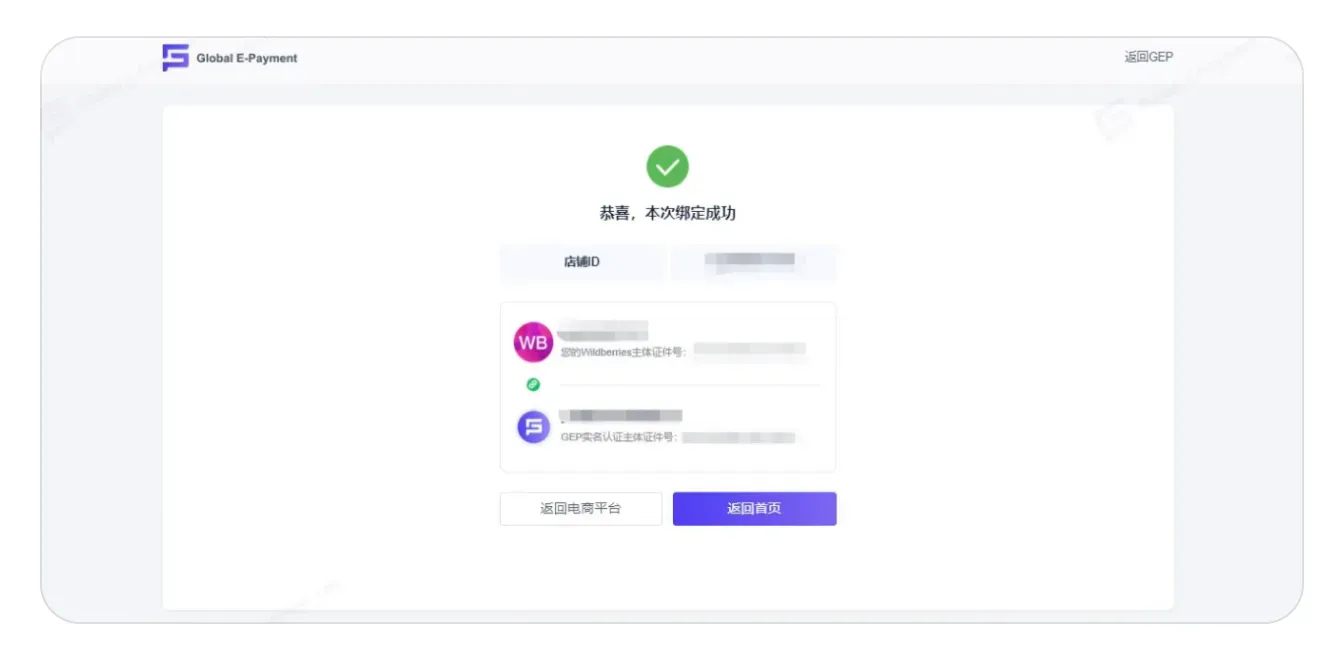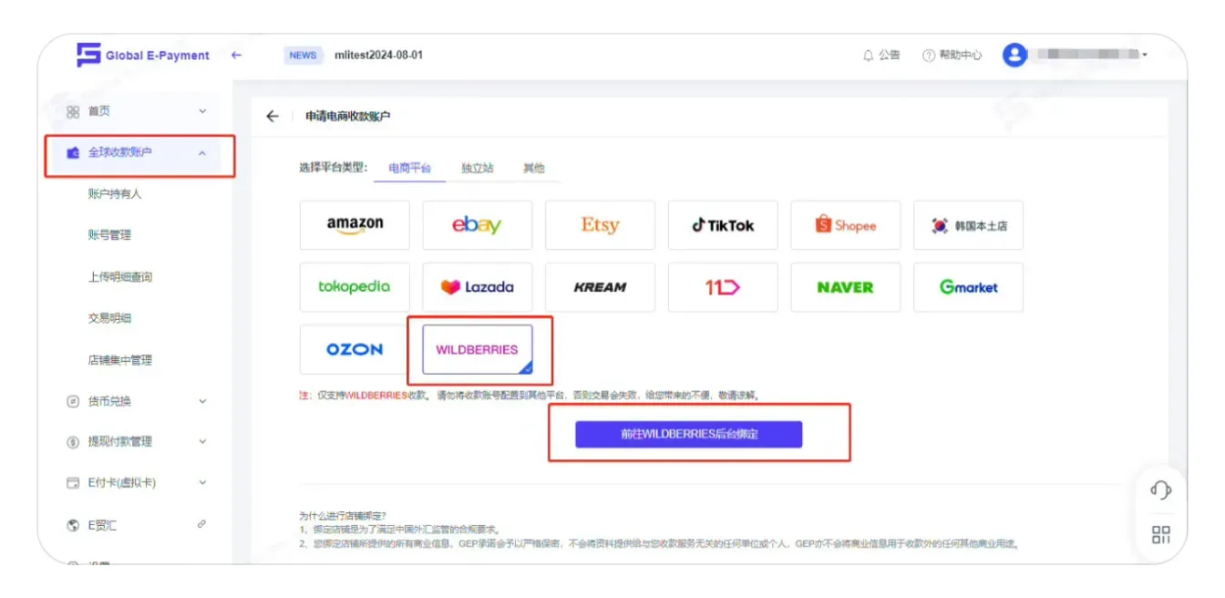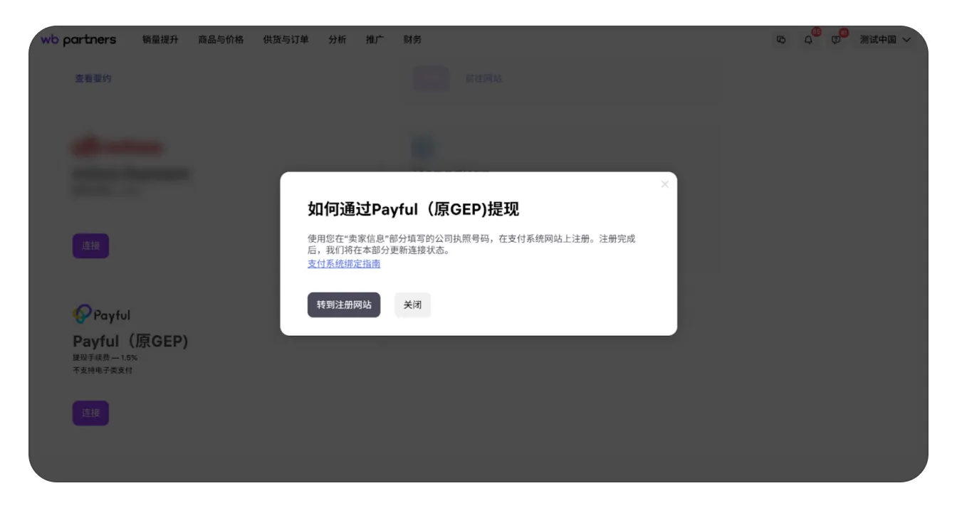 进入Payful菜单:“全球收款账户”,点击电商收款账户“立即申请” 若您已有WB店铺,点击“前往WILDBERRIES后台绑定”跳转至WB卖家后台,进行登录即可;若您未有WB店铺,可通过Payful用户站跳转到WB进行WB账号注册 出现该弹窗后,点击【转到注册网站】,在Payful完成登陆 通过手机号或者邮箱登录您的Payful帐号登录成功后,系统会判断您的WB主体证件号和Payful主体证件号是否一致若主体证件号一致,您可以直接点击“确认绑定”进行绑定确认是否用该主体证件号绑定,确认后即可绑定成功若主体证件号不一致,您可以选择更换Payful帐号登录或者在当前登录的Payful帐号下新增与WB主体证件号一致的店铺主体更换Payful帐号:您可以更换Payful帐号登录,或者重新注册Payful帐号新增店铺主体:您可以根据您在WB的主体证件号,在Payful新增相同主体证件号的店铺主体返回Payful后,右上角会显示通知,您的WB店铺已经完成绑定