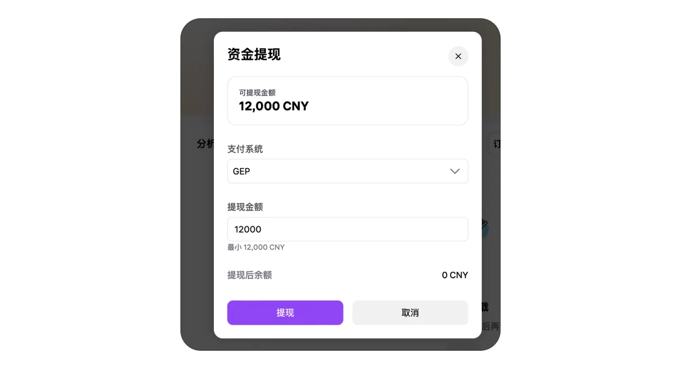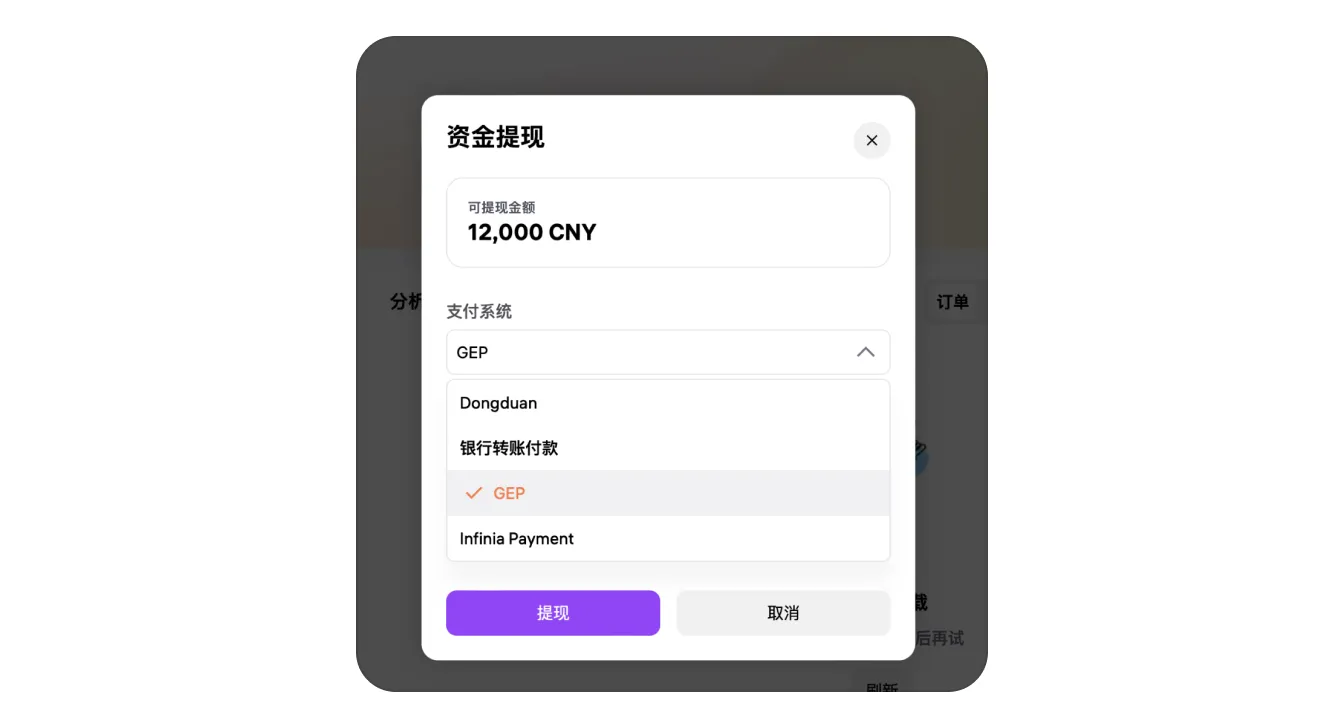 例如,如果您在同一统一社会信用代码下有两个账号,您可以在第一个账号中设置通过 Payful 提现,在第二个账号中设置通过 Dongguan 提现。如果您为两个账号都选择 Payful,那么它们的资金都会进入该支付系统里的同一个账户,但会生成两笔独立的付款记录分别到账。