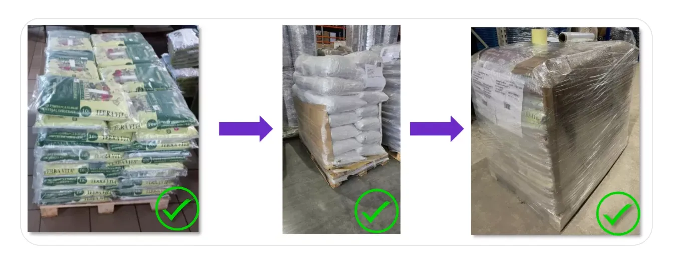 在此包装形式下可托盘发货。为此,应使用纸板将袋子三面包覆,并用透明缠绕膜将其固定在托盘上。关键在于袋子不能滑落,并应便于清点数量。