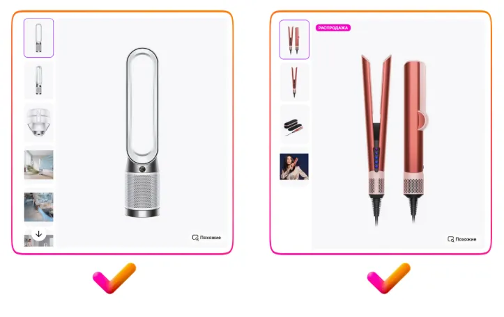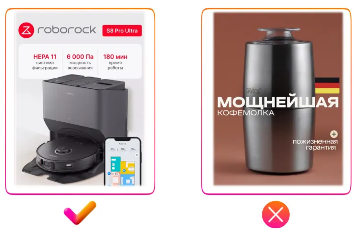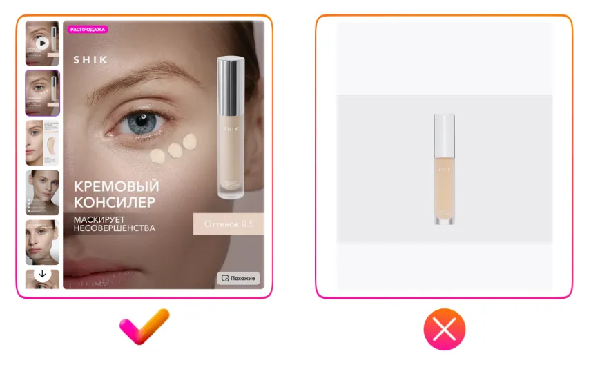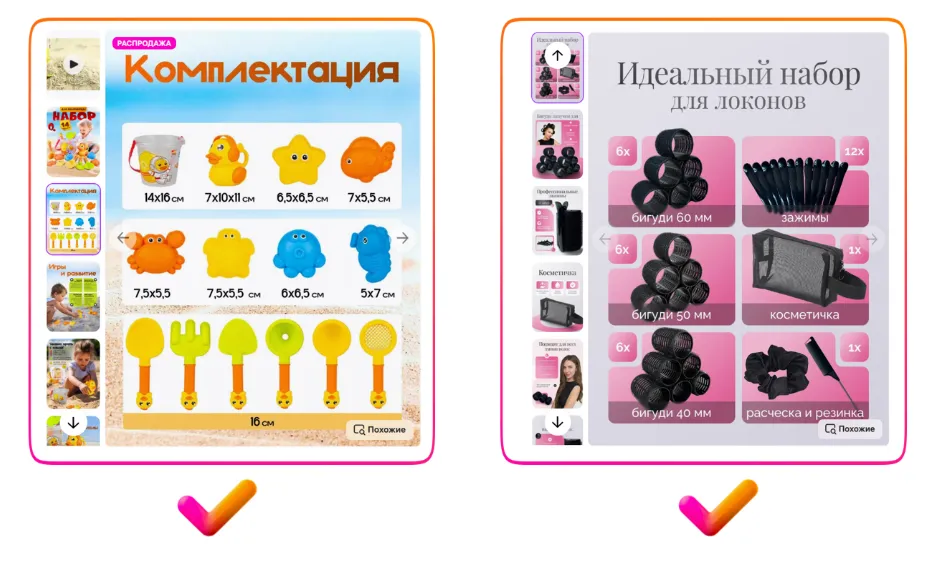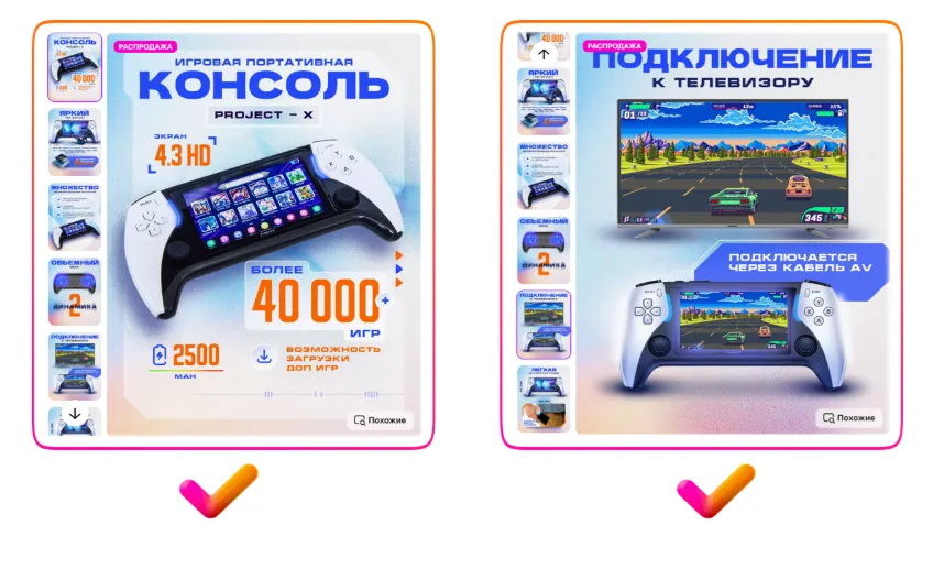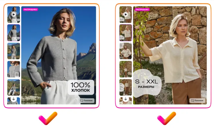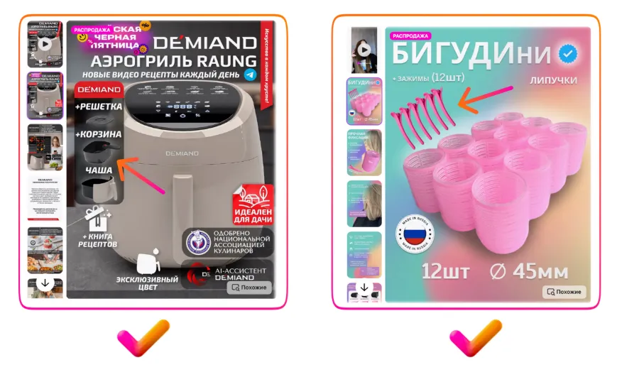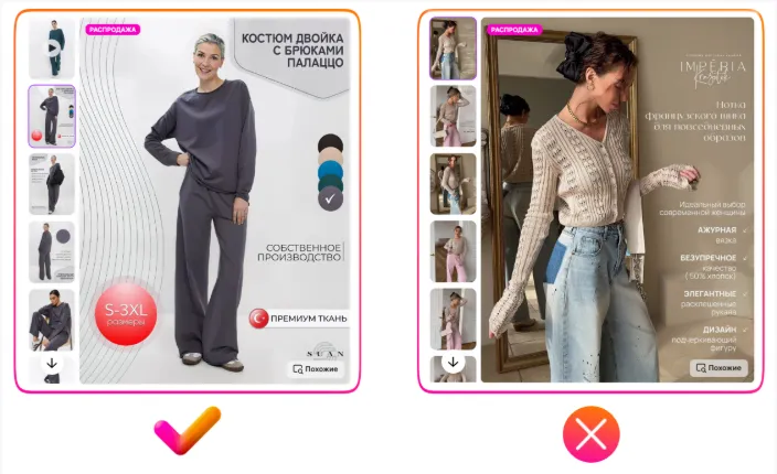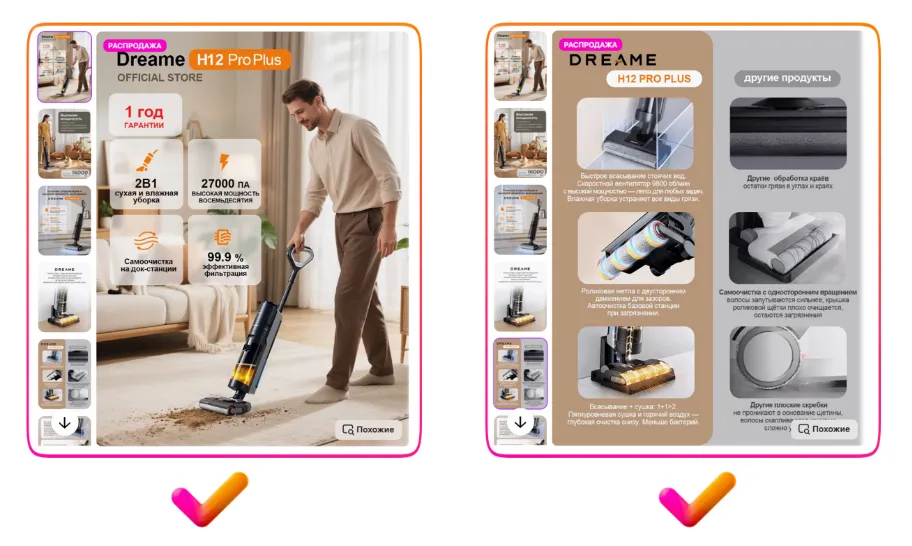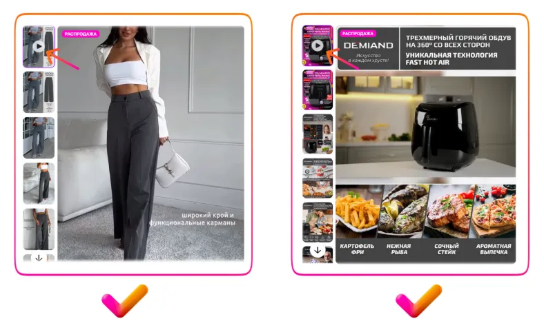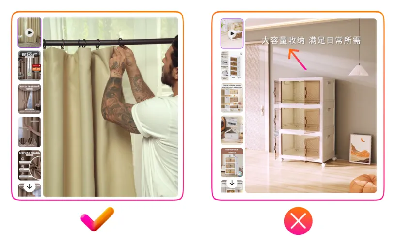请再看左侧第一个示例 — 视频中没有任何字幕,所有重点都集中在商品本身,这才是最关键的。而文字信息完全可以通过信息图的形式展示在商品详情页上,关于这一点将在本指南的后续部分中详细介绍。