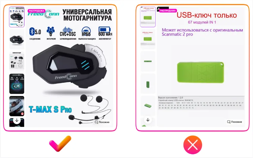 在上方右侧的反例中,商品图片未针对俄语用户做本地化处理,文字采用中英混合形式,商品名称与关键信息标注为英文,这样会影响买家理解,甚至造成反感。