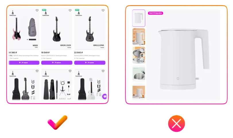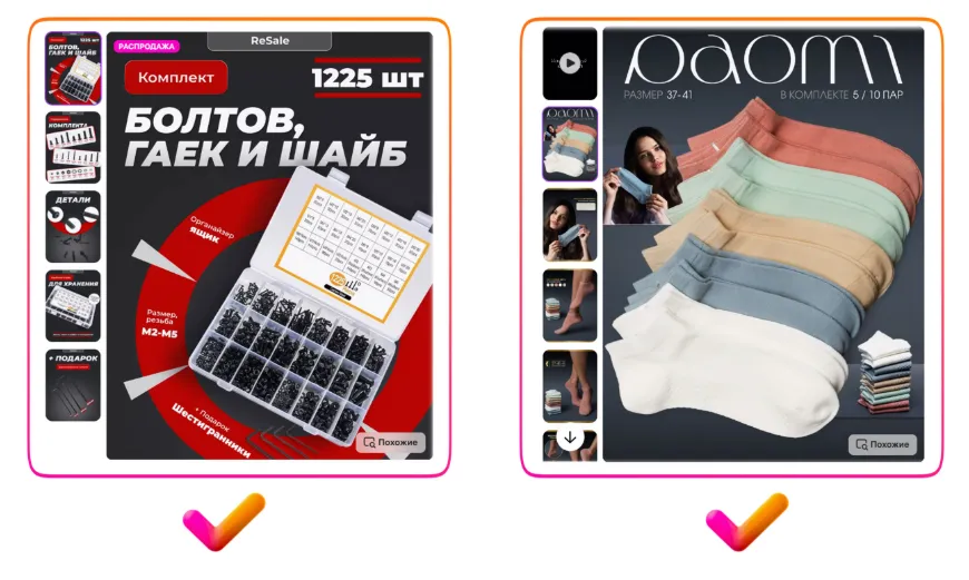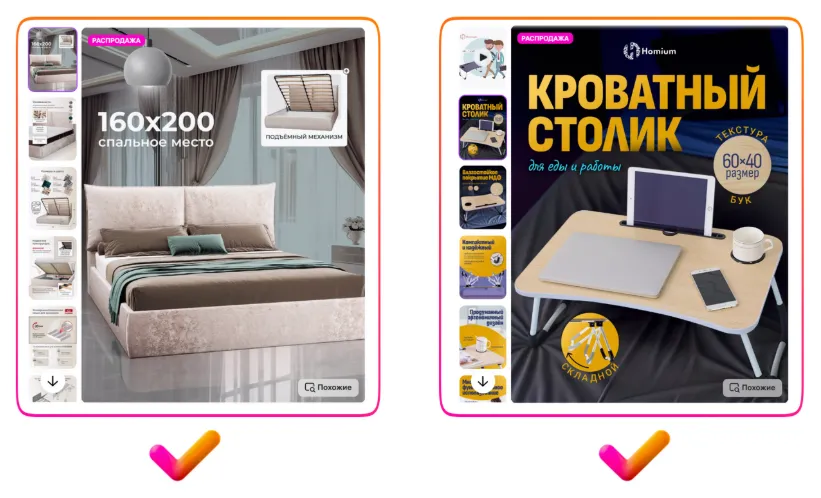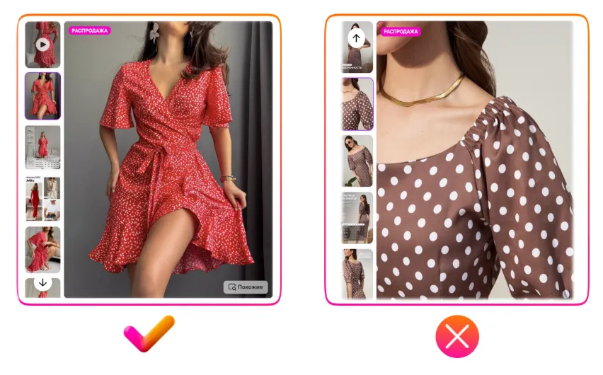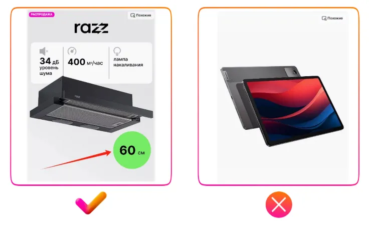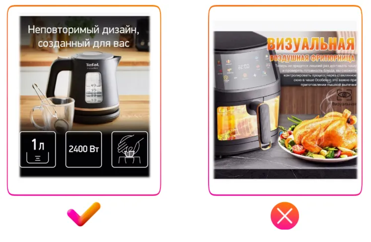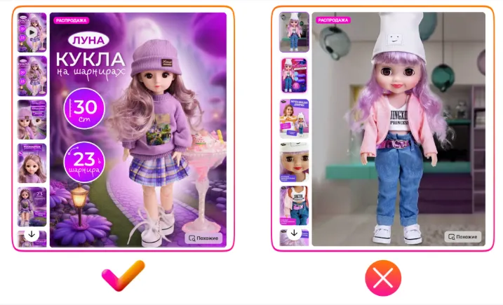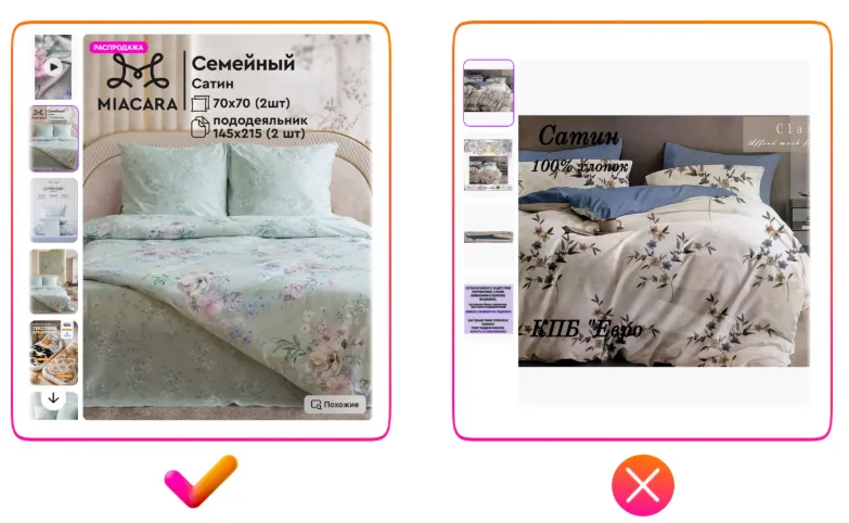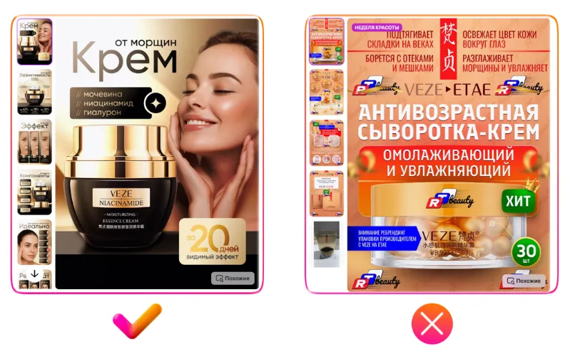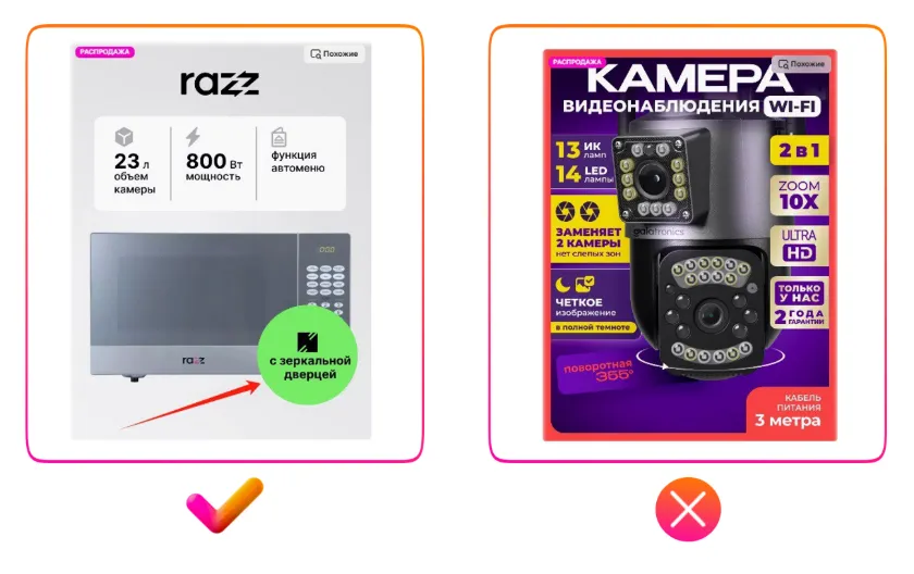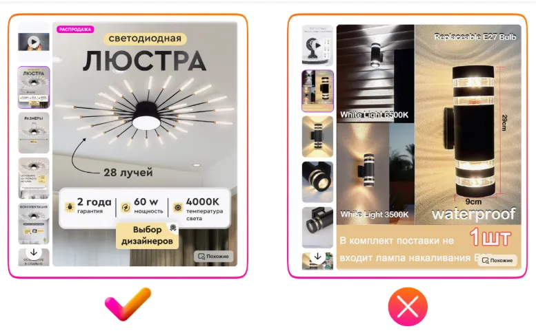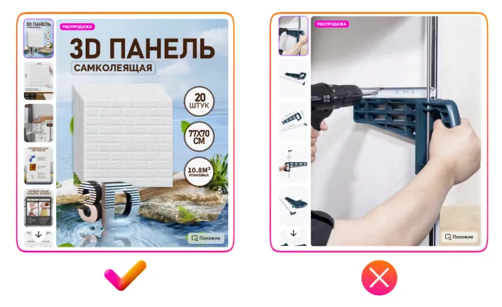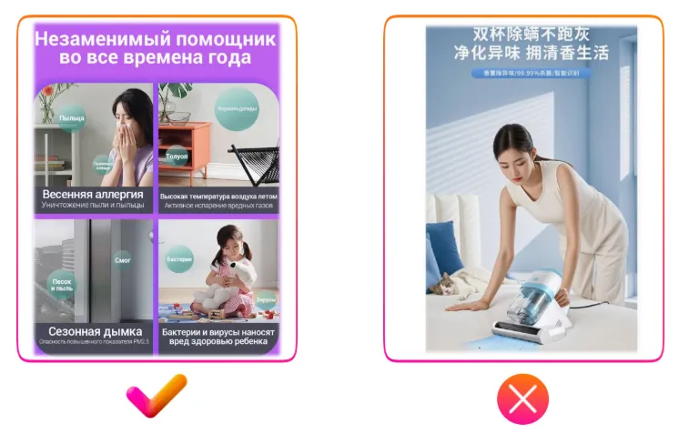 请注意上方右侧反例中出现的严重翻译错误:图片展示的是置物架,但商品主图上却写着“Макароны(意为通心粉)”。很可能原意是“塑料框架”,但因俄汉语法差异(如词尾变化)造成误译。如果您团队中没有俄语母语员工,建议使用中文人工智能工具辅助翻译;或者干脆避免在图片中使用文字,将精力投入在高质量照片上。否则,翻译不当会让买家产生不信任感,降低购买欲望。这是目前中国卖家在商品图片设计中最常见的问题,请务必加以注意。