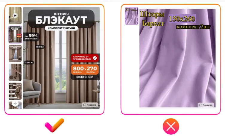 在上方左侧优质示例中,窗帘有详细的视频介绍,清晰展示了材质与质感;卡片边缘以简洁方式标出关键参数(如:遮光帘、尺寸、可选颜色等),设计简洁、信息清晰。