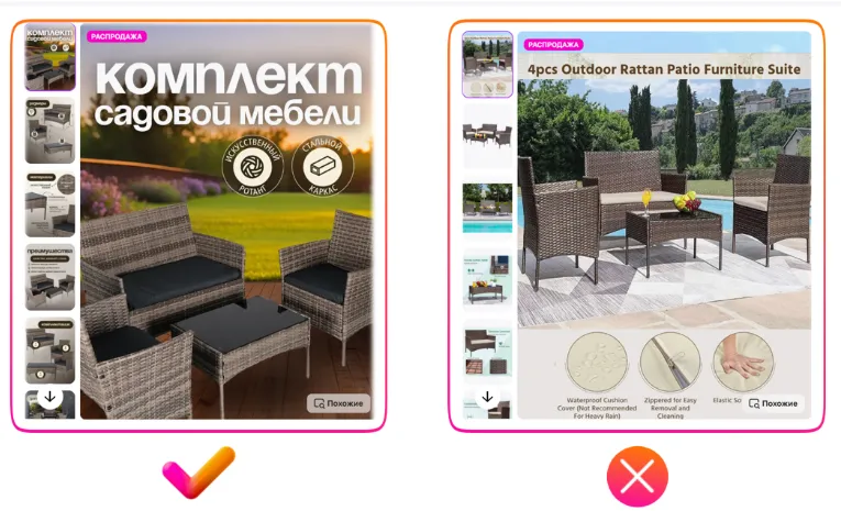 下面我们将分析几个户外家具的案例。请重点关注右下方第二个例子:商品图片上使用了英文信息图。在商品标题、商品描述、以及图片内设计中,语言必须统一为俄语。