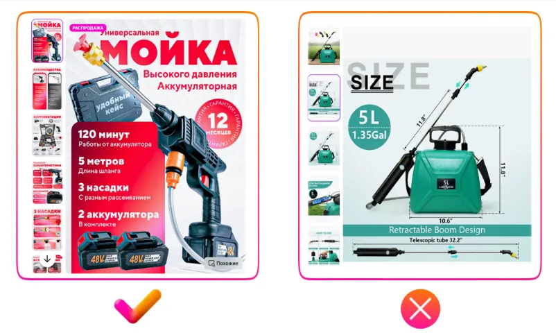 请特别注意,下方左侧的优质示例中,商品的主要参数被清晰地标注出来,设计简洁、重点突出。而右侧反例中,商品图片采用英文,未进行本地化处理。请务必使用俄语进行准确翻译,如无法提供俄语母语翻译人员,可考虑减少文字内容,转而突出高质量、多角度的商品展示内容。