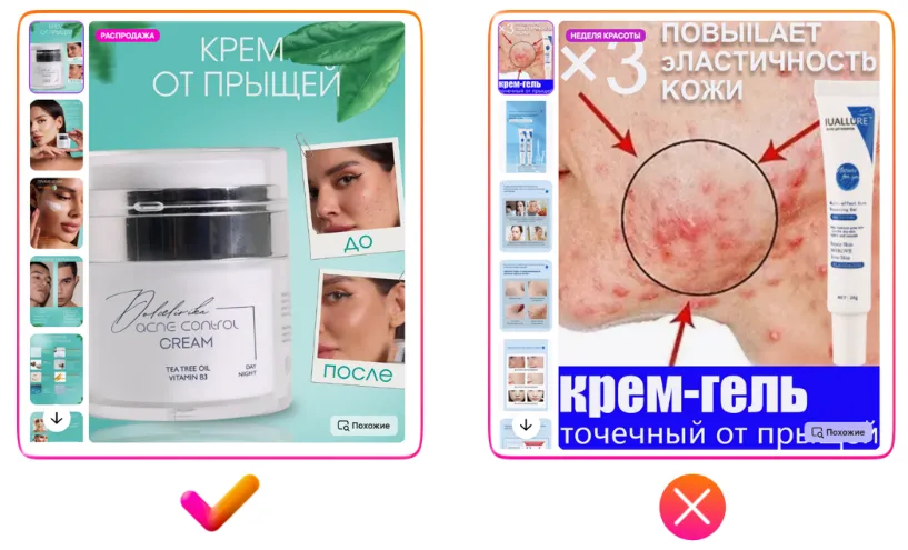 在上方右侧的反例3中,图像过度聚焦于问题性皮肤,反而忽略了产品本身,甚至可能让用户产生反感,导致用户快速划走而不愿点开商品。