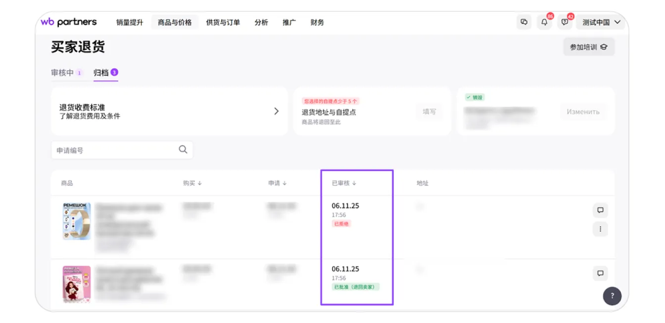 如果您之前拒绝了退货,但之后改变了决定,可以将决定从“已拒绝”修改为“同意无需退货”(仅可修改一次)。操作路径:商品与价格 → 买家退货 → “归档”选项卡。点击申请右侧的三个点,修改答复。在该申请仍显示在“归档”中的前提下,您可以在首次处理申请后的90天内进行修改。