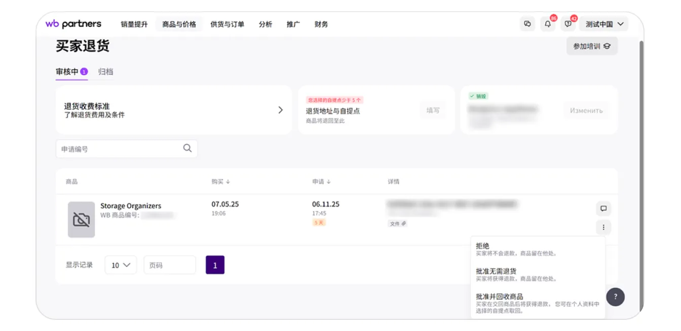 核准和提取货物 — 在这种情况下,商品将退回到俄罗斯的自提点以进行退货处理。如果商品是从中国仓库发货的,则将退还给在“海外”字段中指定的合作伙伴。 商品退回自提点后,款项将退还给买家。