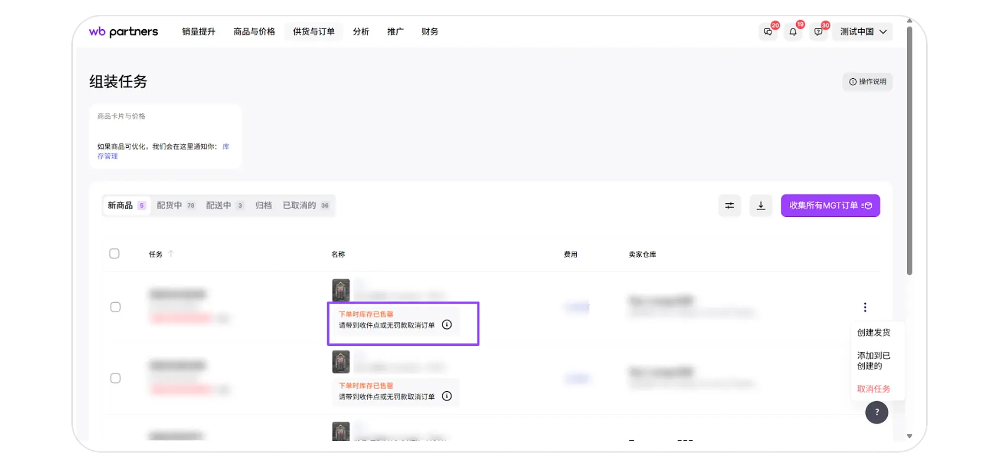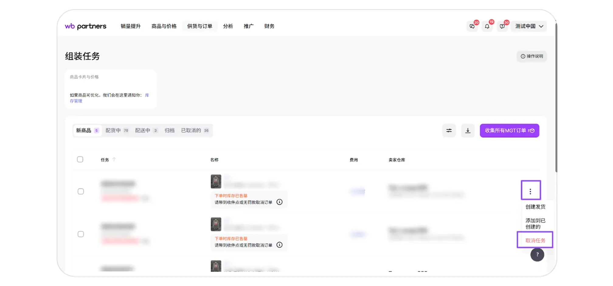 订单取消后,库存不会自动更新—请在 “库存管理” 中自行修改。 如果在配货过程中发现商品缺货、存在缺陷或与商品详情不符而无法发货,您可以取消订单。但在这种情况下,将按照罚款清单第 14 条收取罚款:商品零售价的 50%,但每件商品不少于 100 单位货币。 订单可以在两个阶段取消:“新订单”和“配货中”。订单可在“新订单” 和 “配货中”这两个阶段取消。如果想取消订单,请进入配货任务页面:FBS → “新订单” 或 “配货中” 选项卡,选择需要取消的配货任务,点击右侧的三点按钮,选择 “取消任务”。