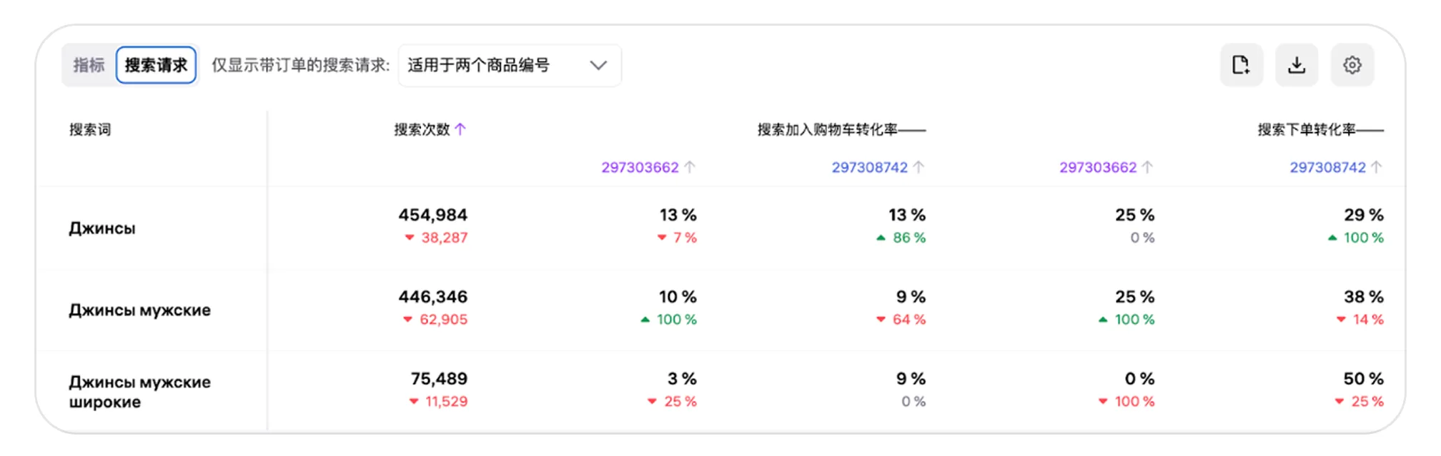 - “搜索请求”:用于对比买家下单所使用的搜索词。
