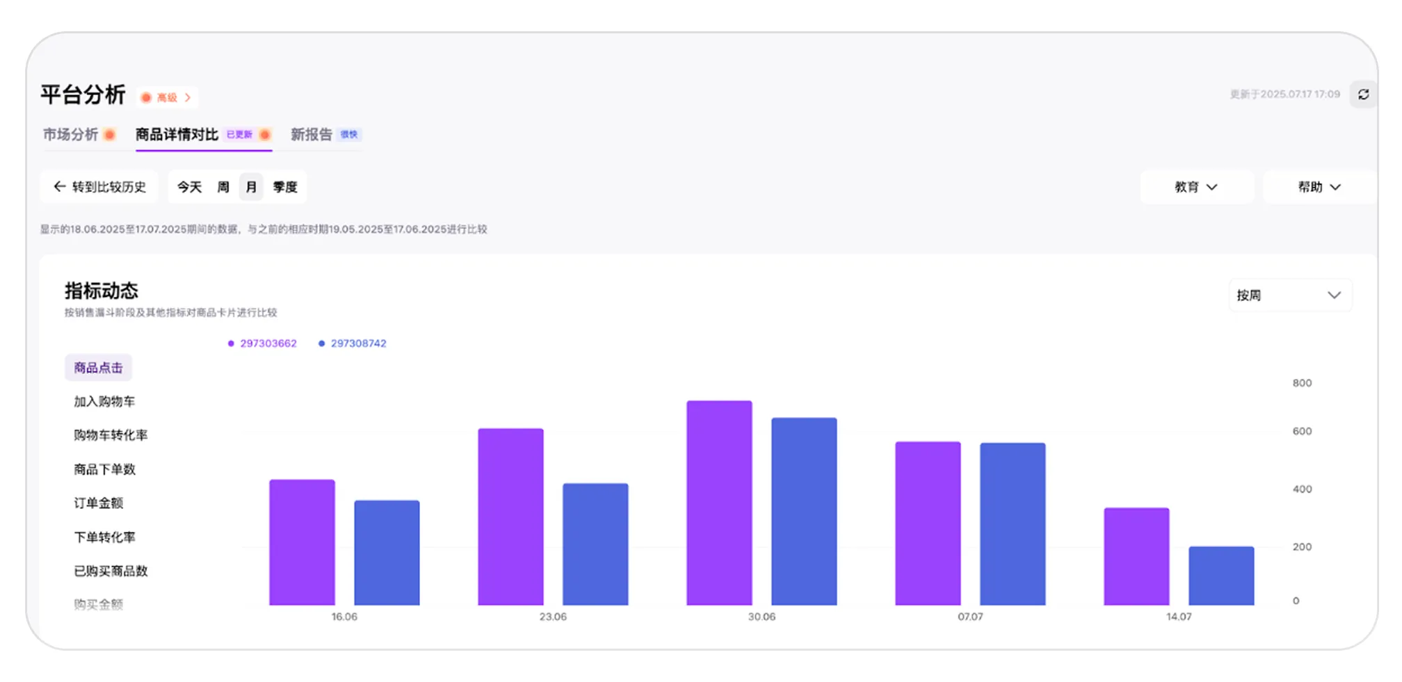 - “指标”:用于对比两个所选商品在销售关键指标上的表现;