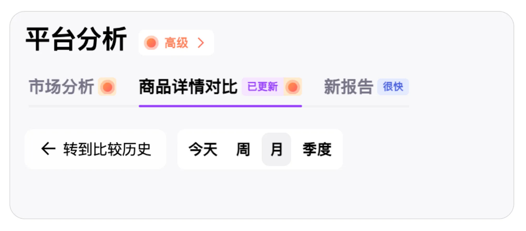 可对比数据的时间范围包括:当日、一周、一个月或一个季度。可通过按钮选择所需时间段。切换时间段不会消耗额度。