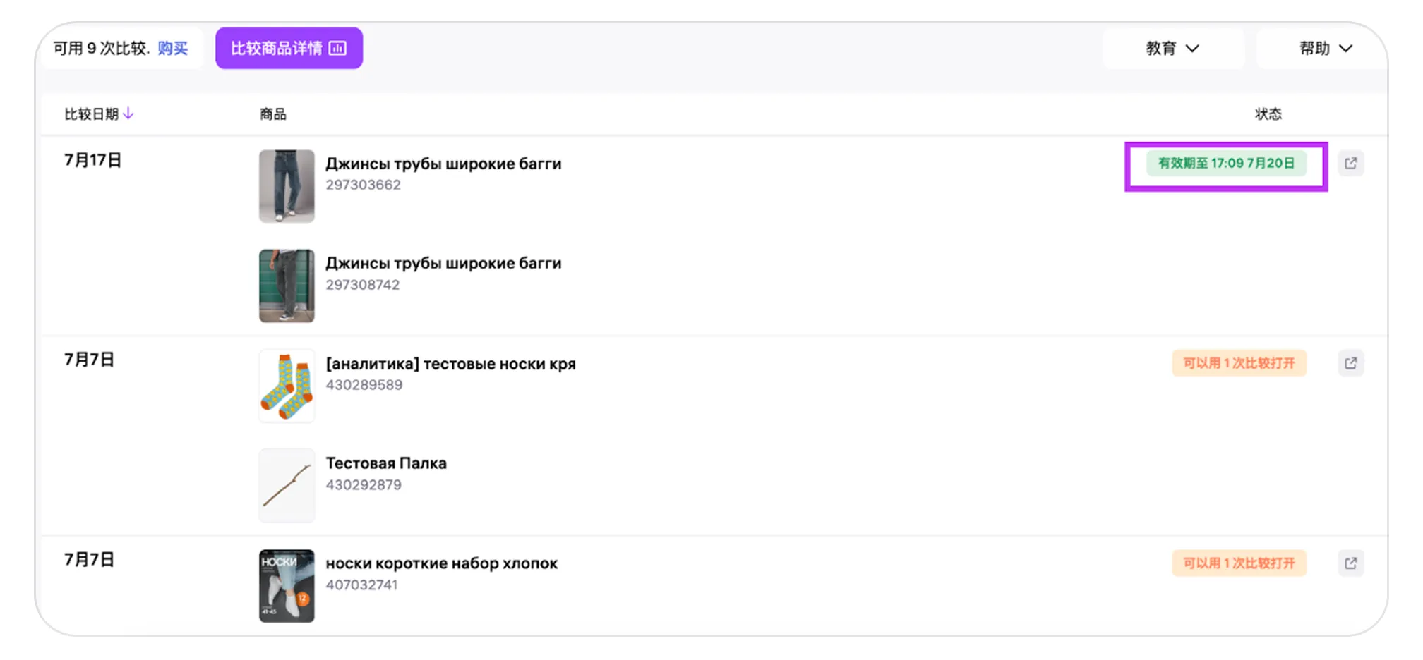 您还可以在Jam订阅页面的“订阅服务”部分购买比较次数并查看使用记录。在订阅有效期内,最多可进行1100次商品对比。 1. 进入“平台分析 → 商品对比”。如果您之前进行过对比,页面会显示历史记录。
