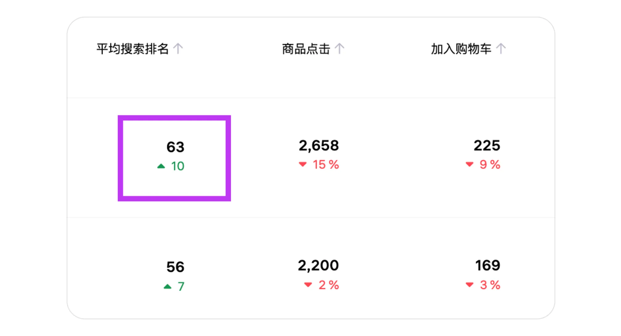 - 搜索平均排名 — 统计买家在搜索结果中点击进入商品页面或加入购物车时所处的平均搜索排名,仅计算这些具体操作所产生的排名。