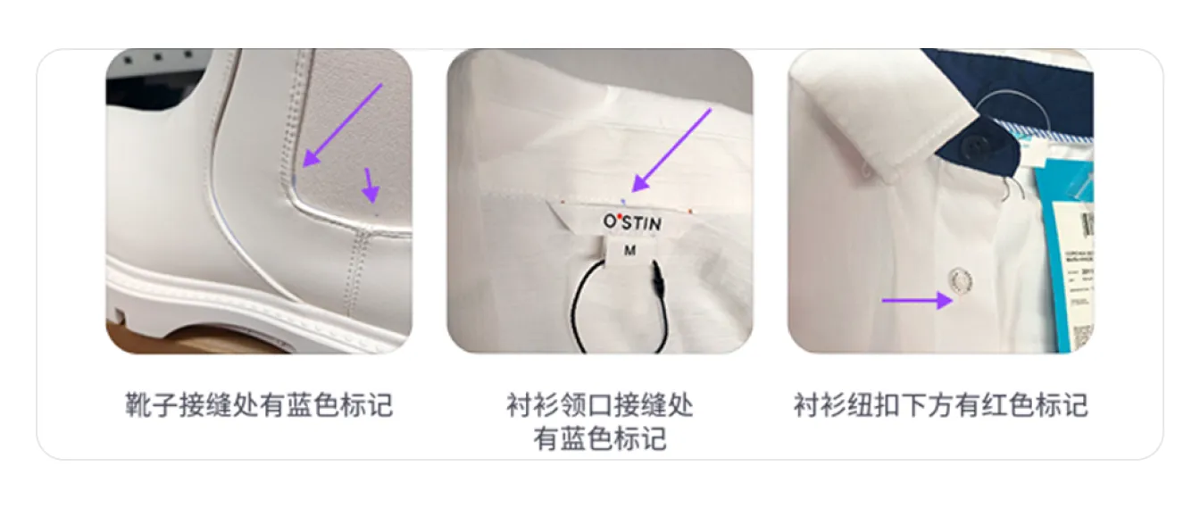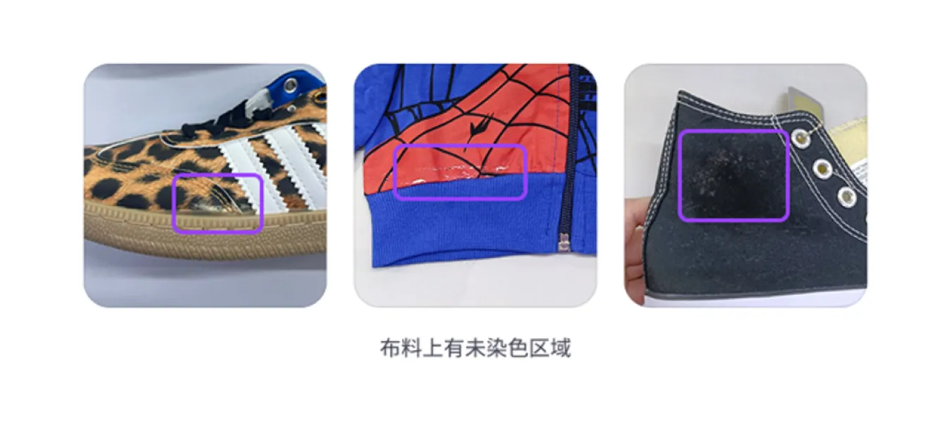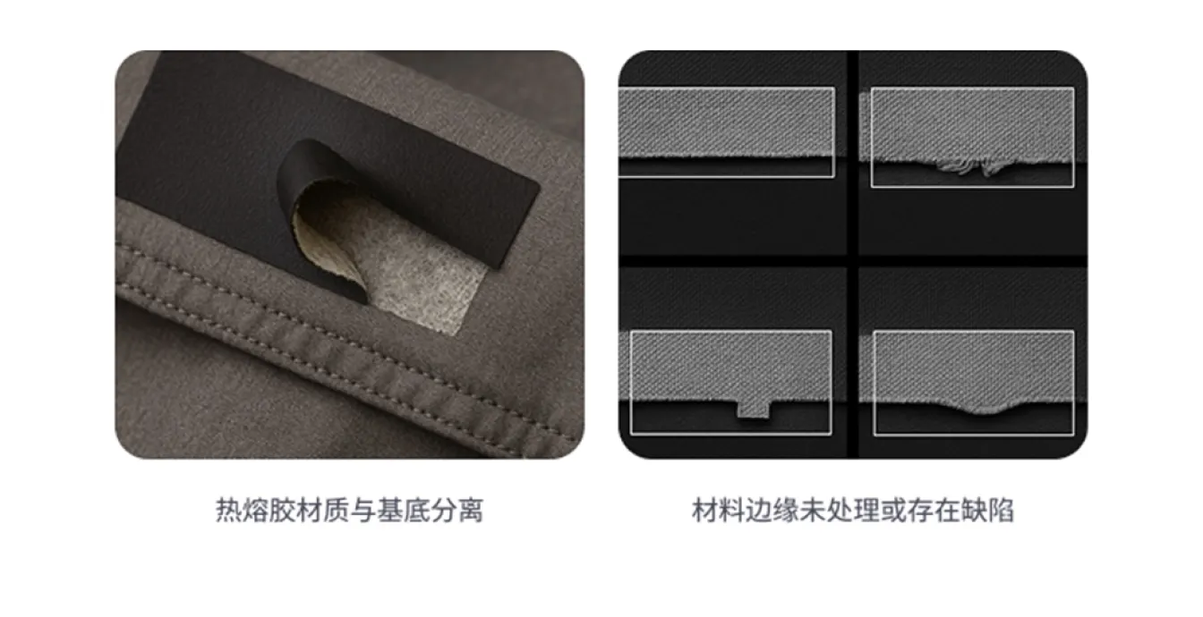 - 颜色和材质结构缺陷: 布料颜色、图案或纹理不一致,存在明显色差,有未染色区域,绒毛方向不同或发生变化,材料边缘未处理或存在缺陷,热熔胶材质与服装部件的基底分离。