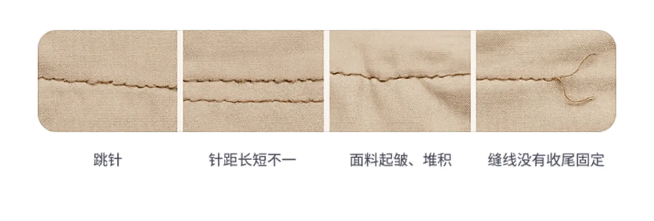- 缝纫缺陷:针脚不正确、针距分布不均、跳针、线迹过紧或过松、缝线弯曲等。例如: