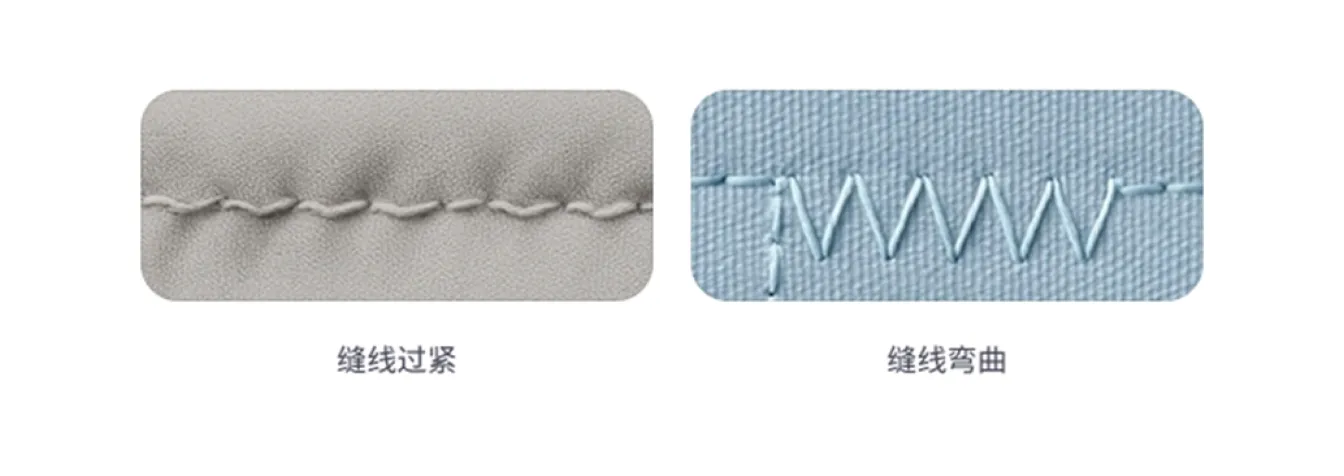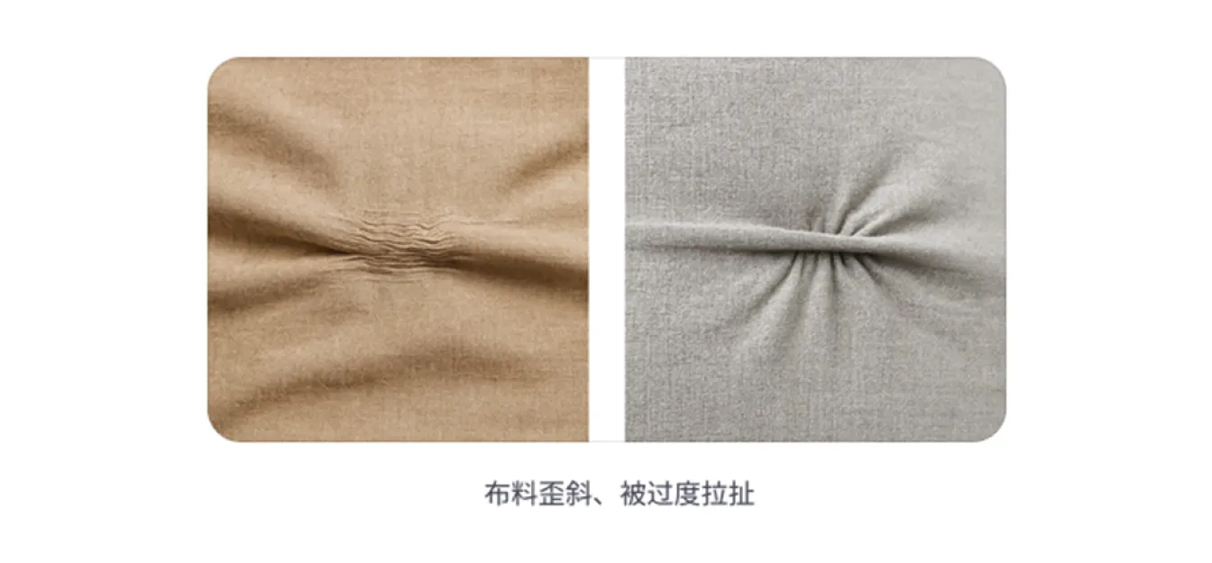 - 材料歪斜或拉扯: 部件缝制不平整,布料过度拉伸或过于松弛,边缘被拉长或变形。