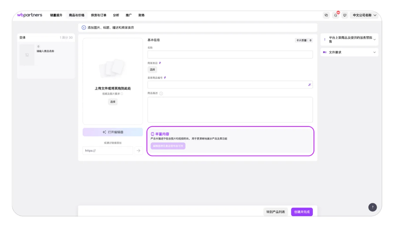 首先请创建商品并保存。当商品发布之后您将可以打开商品编辑器并添加富媒体内容。