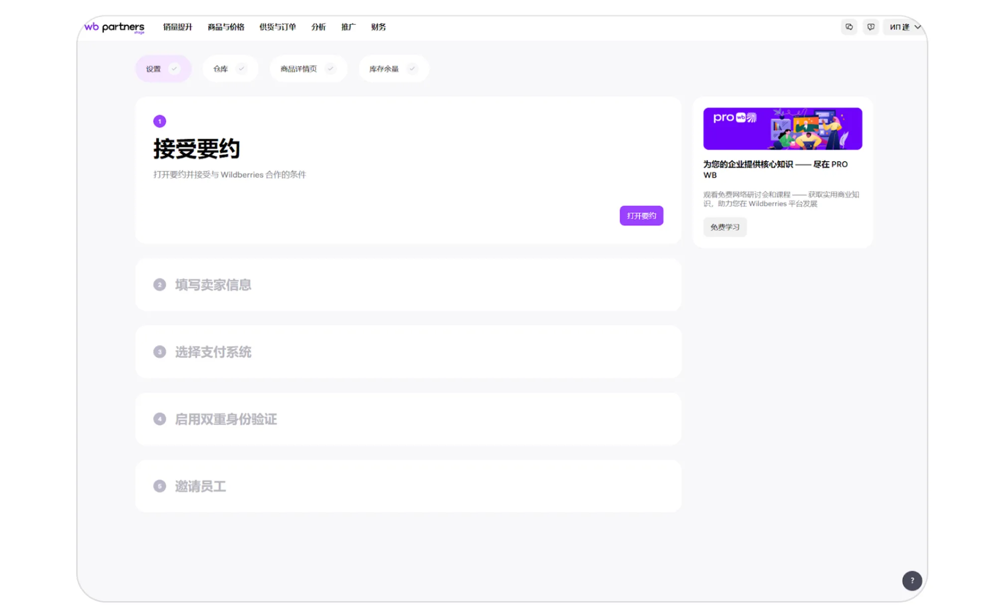 之后,您将能够访问 seller.wildberries.cn 的所有内容。如果一天之后个人帐户还没有被激活,请在“激活个人账户”类别中创建一条主题为“个人账户激活问题”的咨询请求。