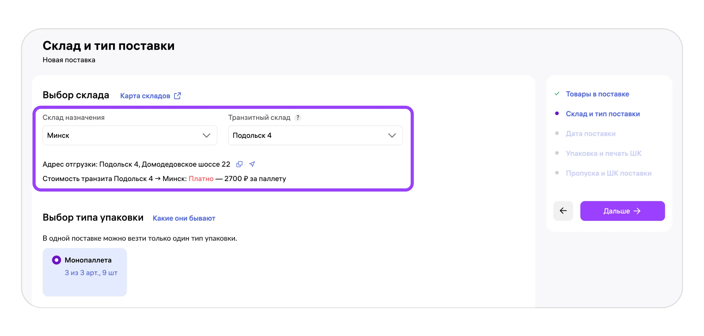 На экране планирования вам будет предложено выбрать тип поставки (тип упаковки). Доступные варианты зависят от объёма и специфики товаров в поставке.