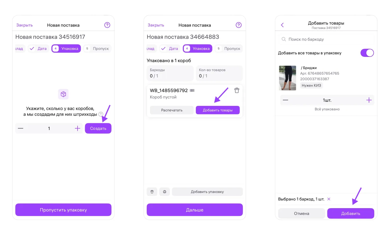 В процессе создания поставки сохраняется шаблон, к которому можно вернуться позже. Вы можете добавить товары в уже существующую поставку или создать новую.