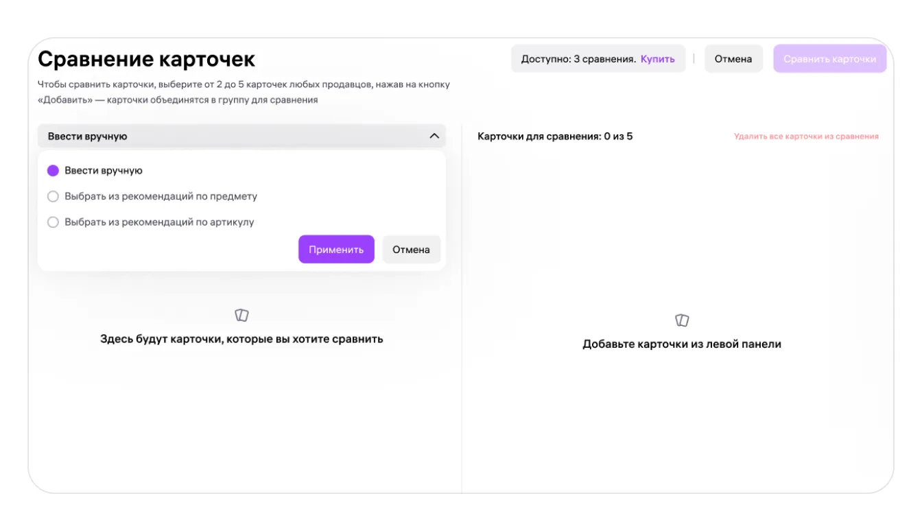 Если вы уже знаете артикулы карточек, которые будете сравнивать, можете ввести их вручную, а затем начать сравнение.