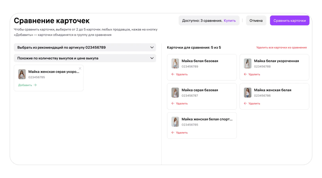 Сравнение карточек доступно пользователям подписки «Джем». Количество бесплатных сравнений зависит от тарифа: