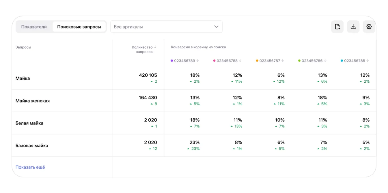 В таблице показано, по каким поисковым запросам покупатели заказали этот товар, сколько было таких запросов и какова конверсия в корзину, то есть доля добавлений товара в корзину по отношению ко всем переходам в карточку из поиска, и конверсия в заказ — доля заказов по отношению ко всем добавлениям товара из поиска в корзину.