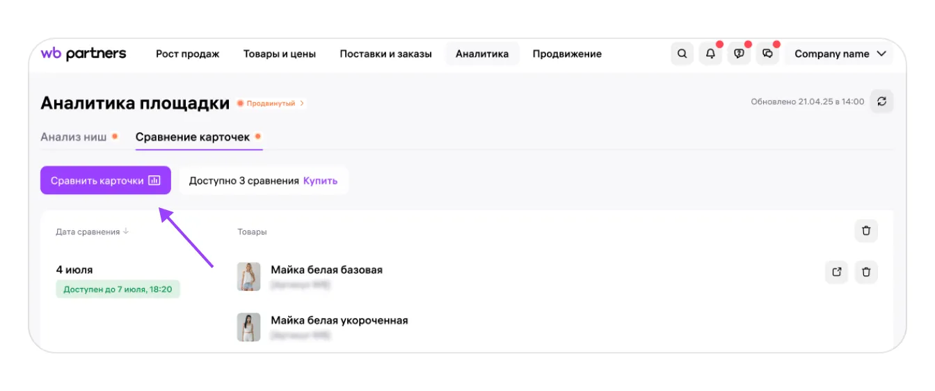 При этом если после удаления потребуется ещё раз посмотреть данные сравнения тех же артикулов, а 72 часа с момента формирования отчёта ещё не истекли, сформируйте отчёт по этим же артикулам ещё раз — в этом случае новый лимит не спишется.