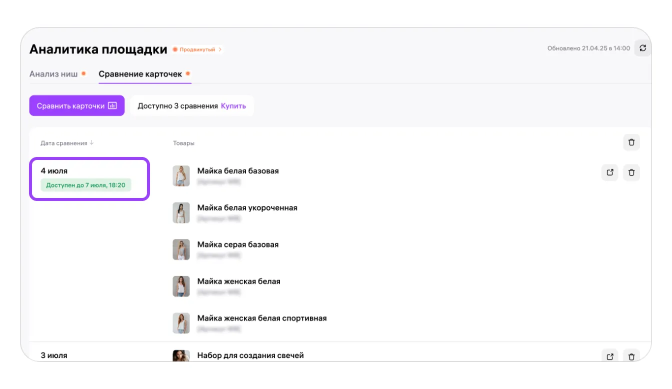 Если захотите снова сравнить те же карточки, нажмите «Можно открыть за 1 сравнение» в истории на странице отчёта — спишется ещё одно сравнение и данные вновь можно будет просматривать и скачивать 72 часа.