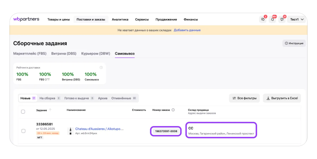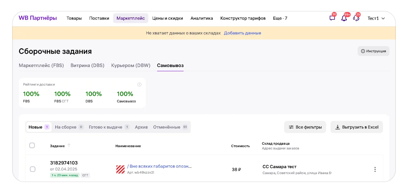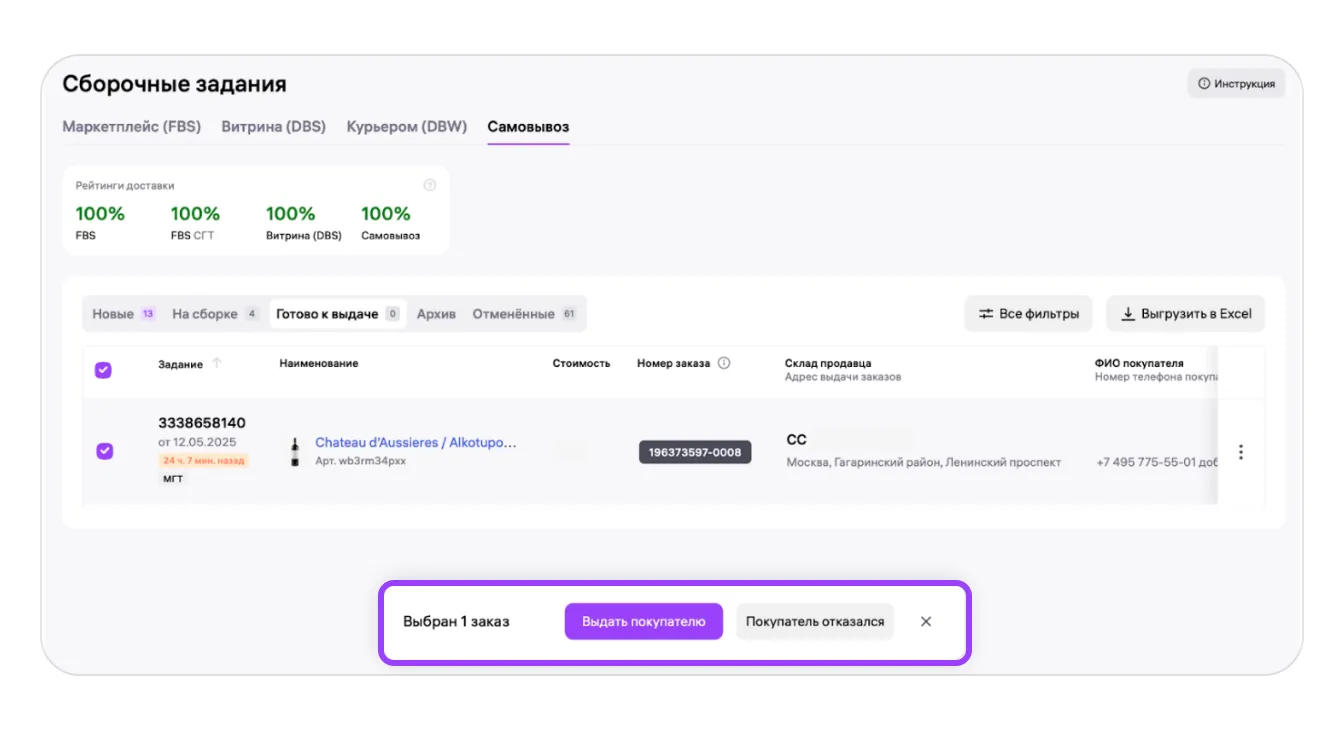 После получения нового сборочного задания передайте его на сборку. В сборочном задании будет указан адрес торговой точки, которую покупатель выбрал для самовывоза, и номер заказа, по которому сотрудник торговой точки сможет его найти.