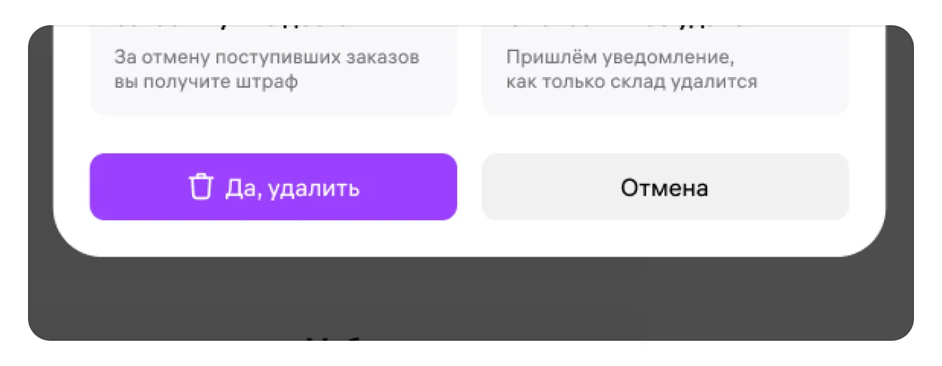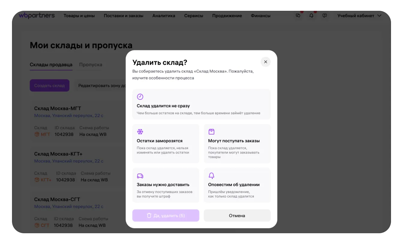 Кнопка «Да, удалить» станет активной через 5 секунд после появления окна. Нажмите её, чтобы удалить склад, или «Отмена», если вы передумали.