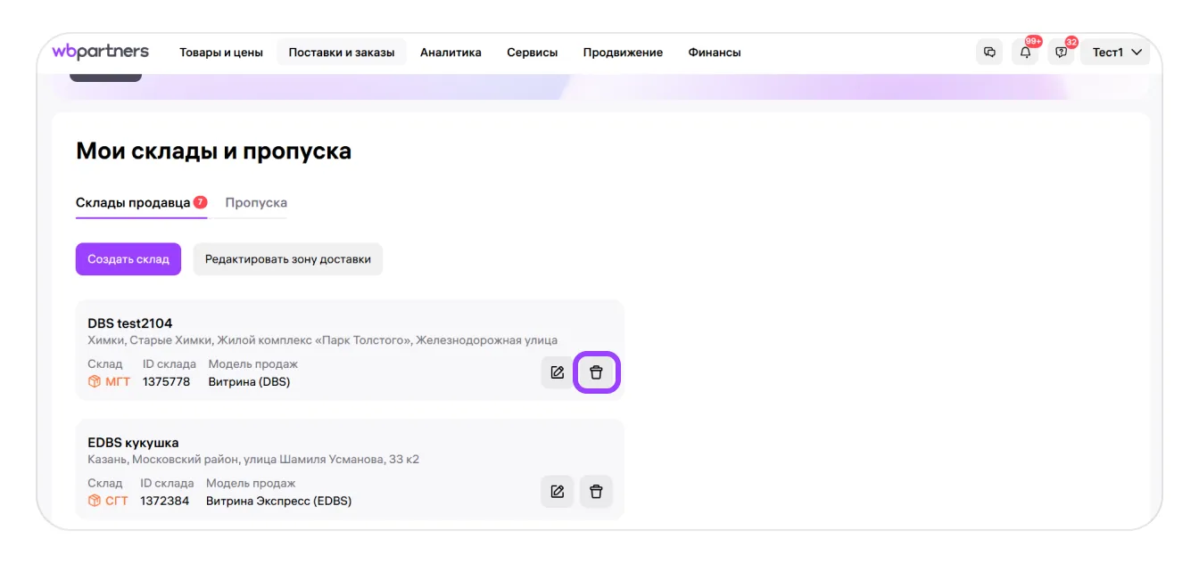 Если вы хотите удалить склад, нажмите на иконку «Корзина» около нужного склада.