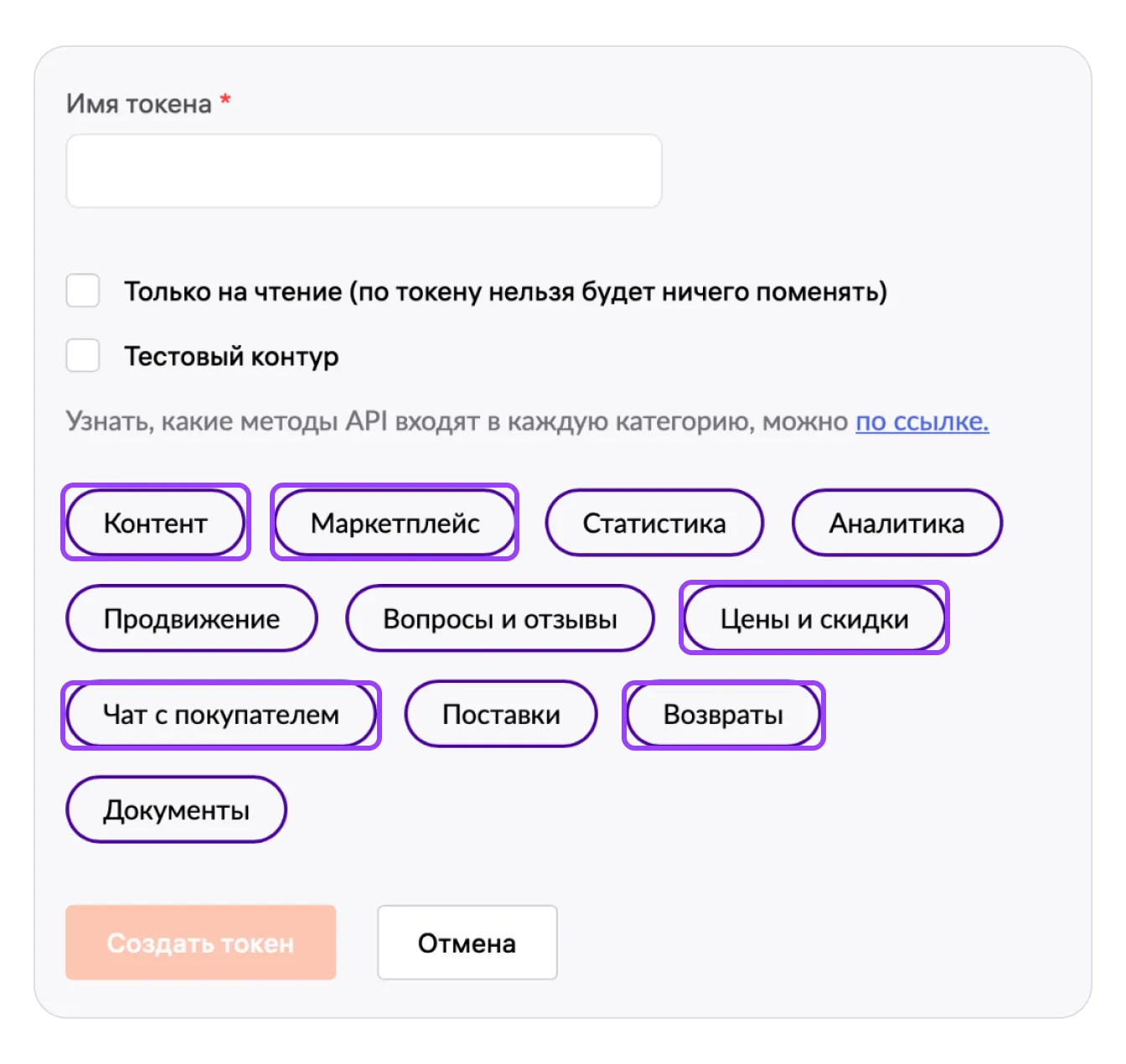 Выберите методы «Контент», «Цены и скидки», «Маркетплейс», «Чат с покупателем» и «Возвраты».