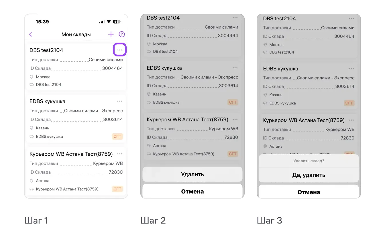 Нажмите три точки справа от нужного склада. Появятся кнопки «Удалить» и «Отмена». Нажав «Удалить», подтвердите своё действие, нажав кнопку ещё раз. Или нажмите «Отмена», если передумали.