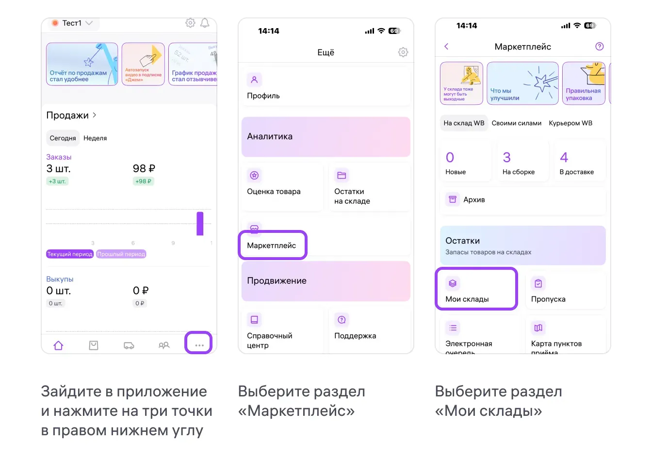 Чтобы удалить склад в мобильном приложении, зайдите в раздел «Мои склады», как указано на изображениях ниже.