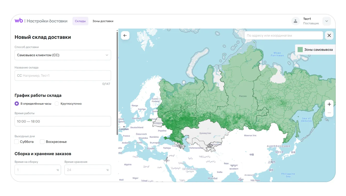 Зоны, в которых можно создать склад самовывоза, выделены на карте зелёным цветом. Если зона не выделена зелёным цветом, создать склад не получится