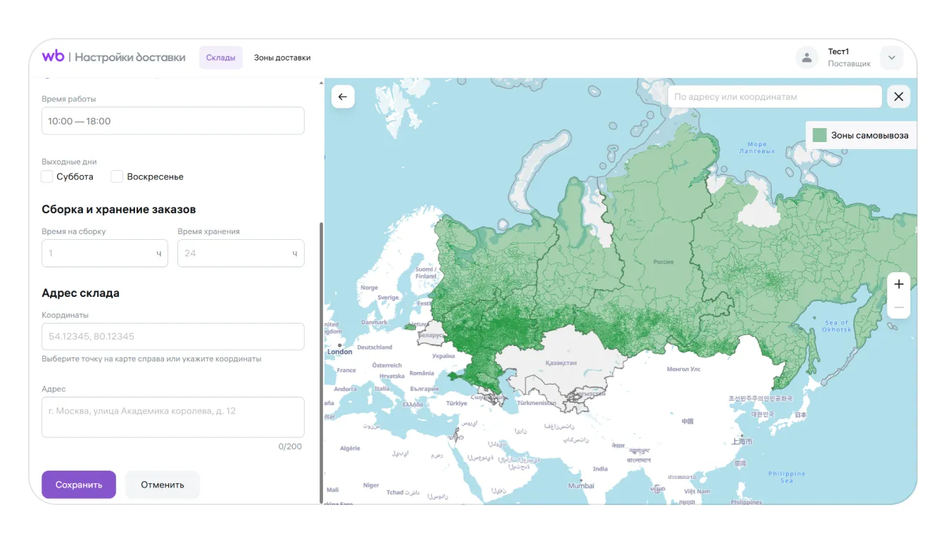 Нажмите «Сохранить». Зона самовывоза будет автоматически создана в соответствии с координатами торговой точки.
