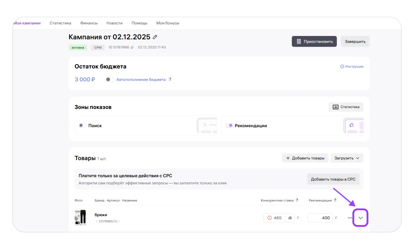 Чтобы посмотреть «Топ поисковых кластеров», откройте активную кампанию по продвижению и нажмите на стрелку в блоке «Товары».