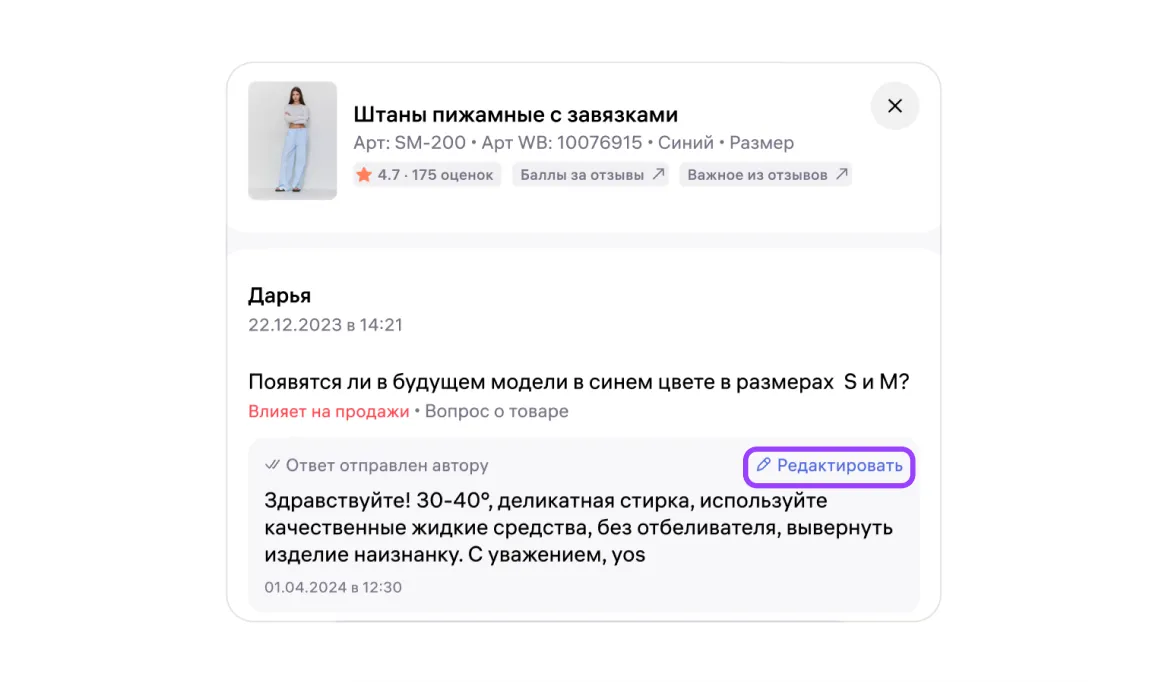 • Опубликован для всех: ваш ответ прошёл модерацию и виден всем на сайте и в приложении Wildberries;