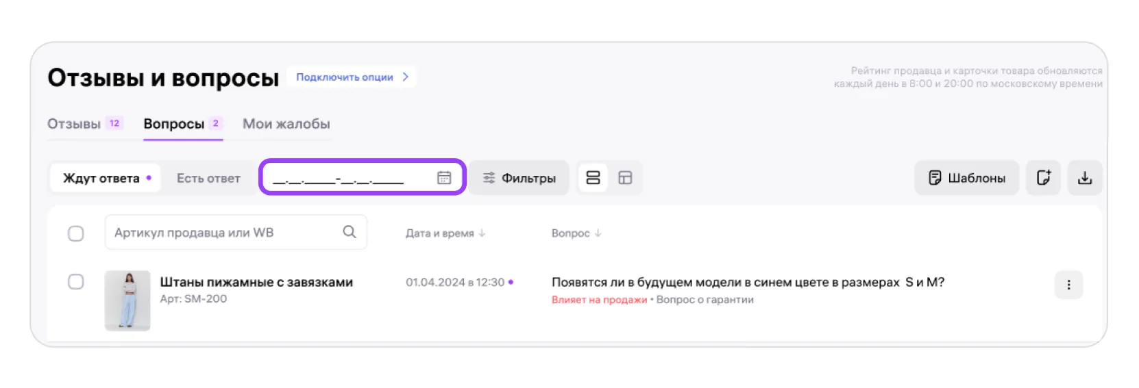Чтобы посмотреть вопросы за конкретную дату или период, нажмите на календарь и выберите нужные числа: