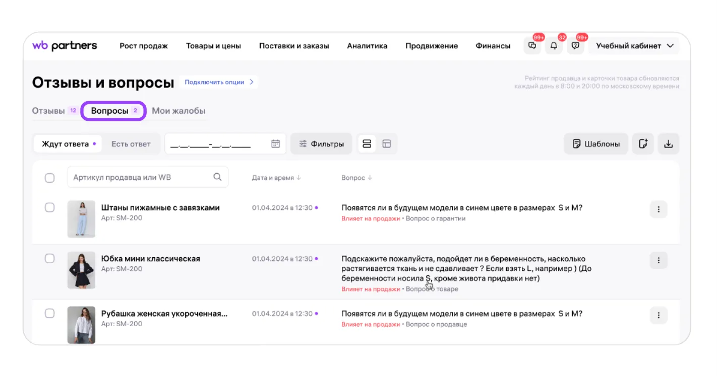 • Ждут ответа — вопросы покупателей, на которые вы пока не отреагировали.