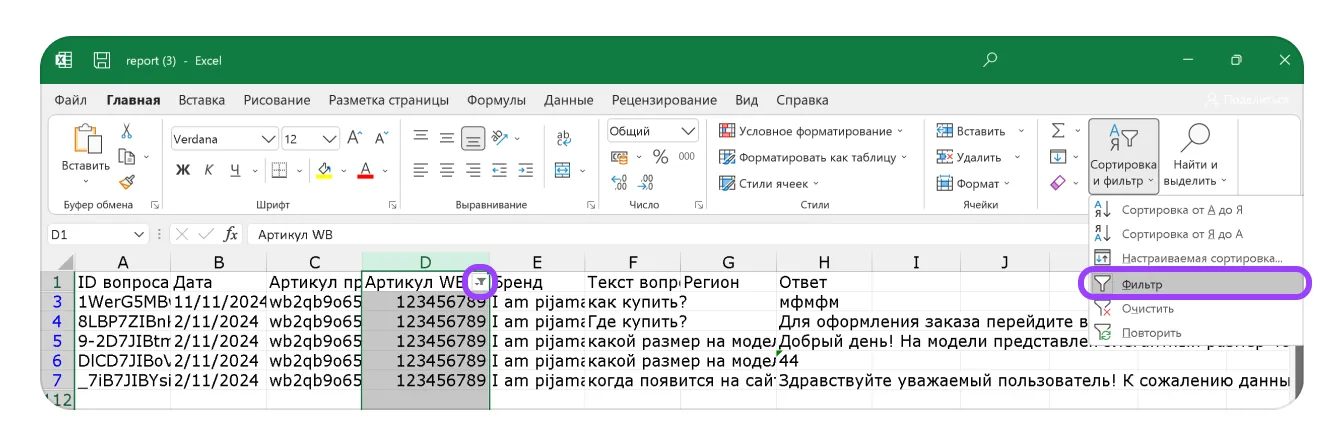 Чтобы посмотреть в XLSX-файле все вопросы про конкретный товар, добавьте фильтр на столбец с артикулом WB и выберите из списка нужный артикул: